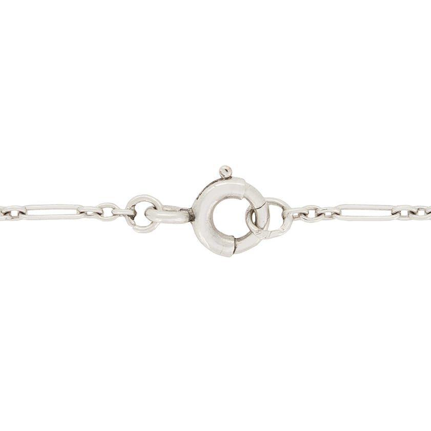 Beautifully designed is this French Art Deco platinum diamond drop necklace. The main focal point of this necklace is the larger diamond, weighing 0.80 carat, which dangles at the bottom with a small 0.05 carat diamond rub over set just above it. It has been estimated as H in colour and SI1 in clarity. Nine rose cut diamonds, totalling to 0.09 carat, are set into a tear drop outline drawing attention to the central diamond. Set above attached to the chain are a further five old cut diamonds, totalling to 0.40 carats. It comes with a classic secure clasp. Perfect for those special occasions, this necklace measures 17″.