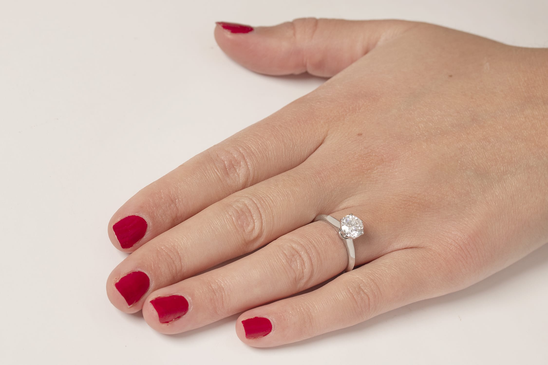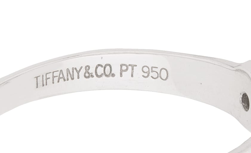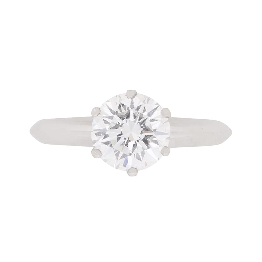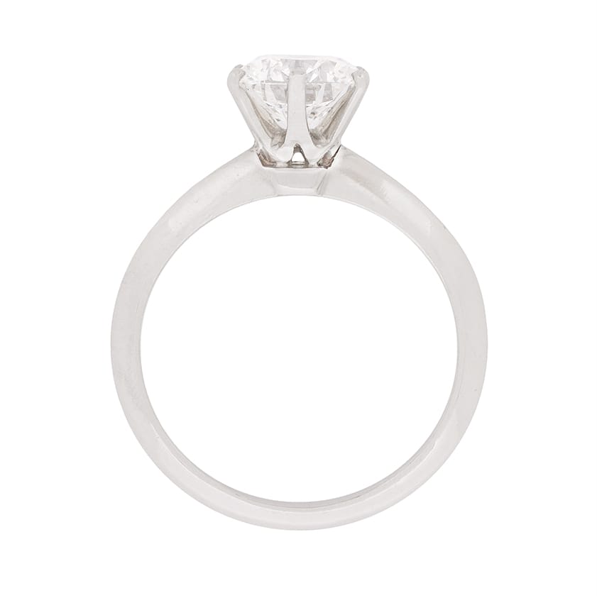 The iconic Tiffany & Co. diamond solitaire engagement ring is one of the most coveted rings of all time. This enviable ring showcases a stunning, GIA certified, 1.24 carat, round brilliant cut diamond within the jeweller’s renowned six claw, knife-edge, platinum solitaire setting. The dazzling diamond is certified as G in colour and VS2 in clarity. This authentic, pre-owned diamond solitaire engagement ring is signed ‘Tiffany & Co.’ with the appropriate makers marks.