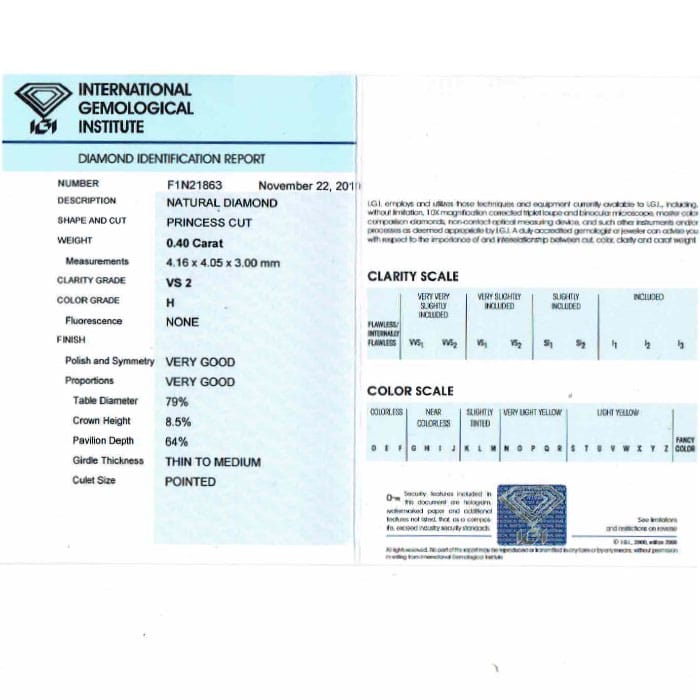 A ring this classic will always be in vogue! This elegantly understated diamond solitaire engagement ring presents a lovely IGI certified princess cut diamond within an 18 carat white gold mounting. The ring’s polished shoulders lead to an ever so slightly tapering shank. The stunning princess cut diamond is 0.40 carat, with a H colour grade and VS2 in clarity.