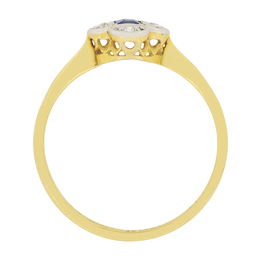 A delicate sapphire and diamond ring from the late art deco period. A carre cut sapphire is in the centre, it is a deep blue colour. Four fans surround the ring, each containing an eight cut diamond weighing 0.02 carat each. The gems are set in platinum, while the band is made of 18 carat yellow gold. This is a very pretty, dainty ring made in the 1930s.