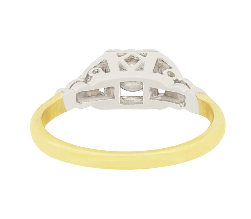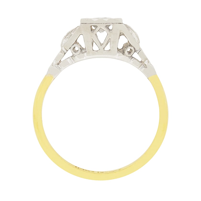 This sweet engagement ring features a 0.25 carat diamond held in a finely detailed setting. The diamond is transitional cut, and is an I colour and VS2 clarity. It is placed within a square, platinum setting featuring lovely carved detailing. The leaf-like shoulders are also made of platinum. The band of this lovely 1930s ring is made of 18 carat yellow gold.