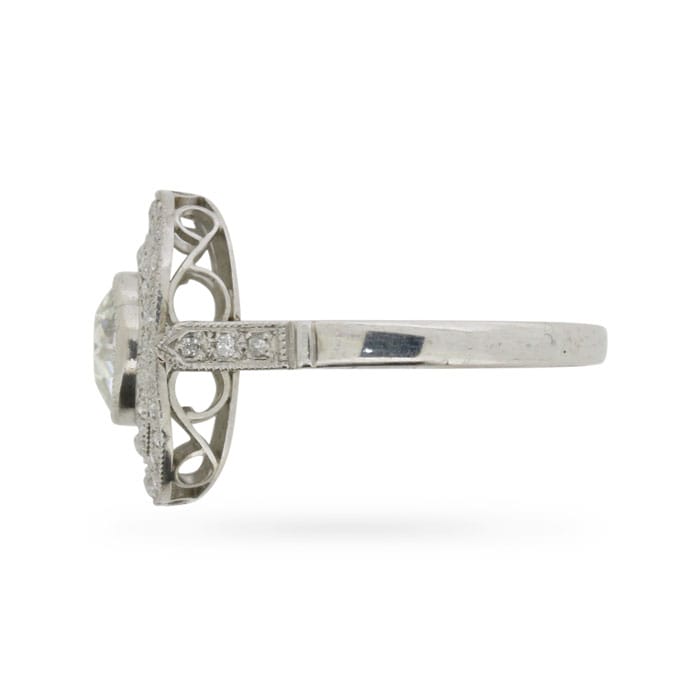 Dating from the latter Art Deco period, this striking c.1930s cluster ring presents an old cut diamond weighing 1.00 carat within a double octagonal halo, consisting of 0.58 carats of grain set old cuts. The diamonds all match in excellent quality, G in colour and VS2 in clarity. The ring’s antique platinum setting is emblematic of its time, featuring desirable period details, including hand-done mille-grain flourishes, gorgeous gallery work and diamond-accented shoulders.