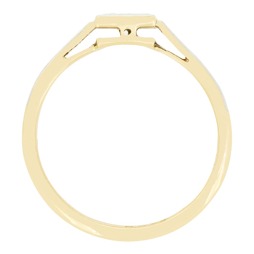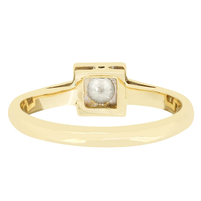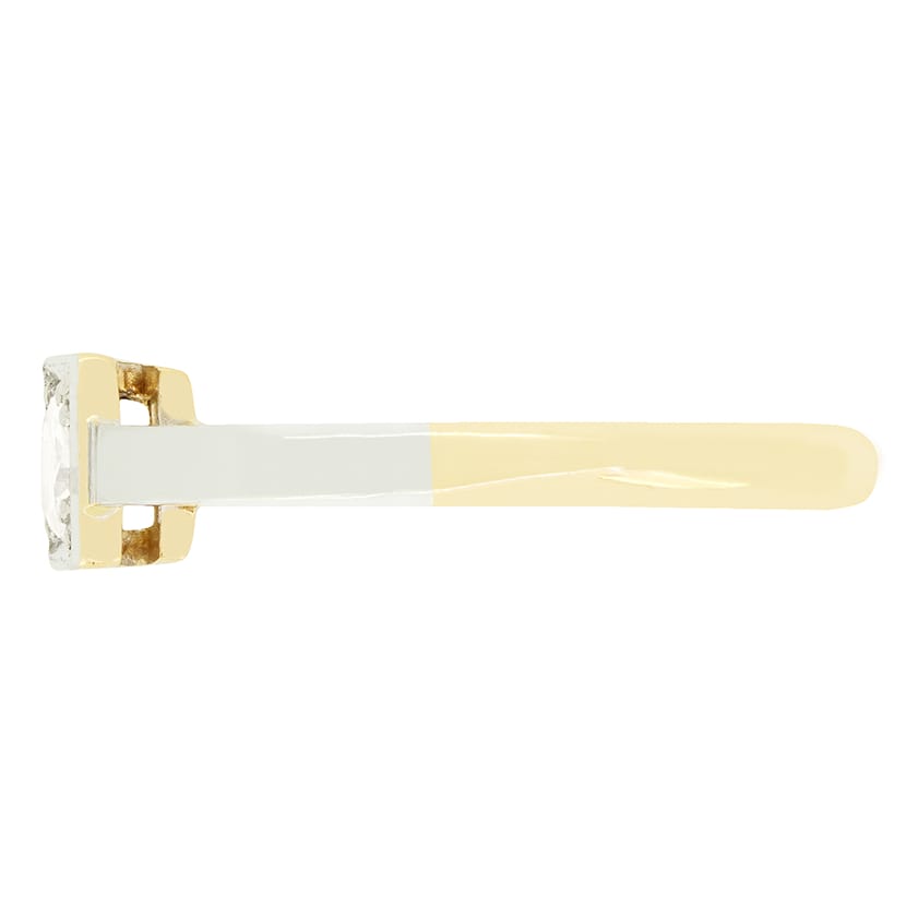 Dating to the 1930s, this charming solitaire ring centres around a transitional cut diamond. The 0.25 carat stone has a colour of G and clarity of VS2 and is grain set into a square collet. The collet and shoulders are crafted in platinum and sit upon a band of 18 carat yellow gold for a wonderful mixed metal look.