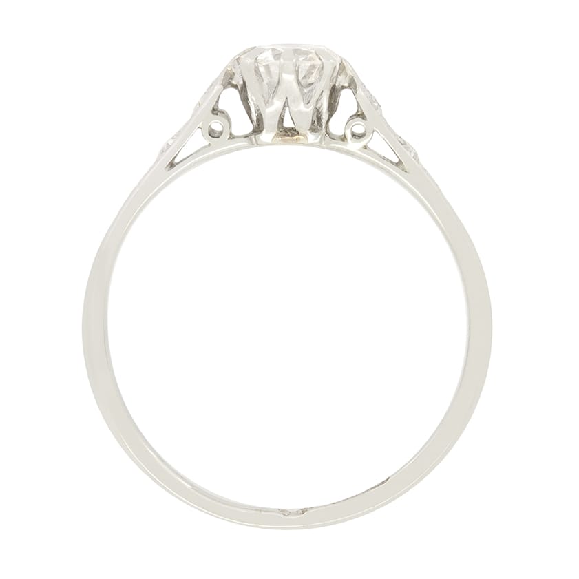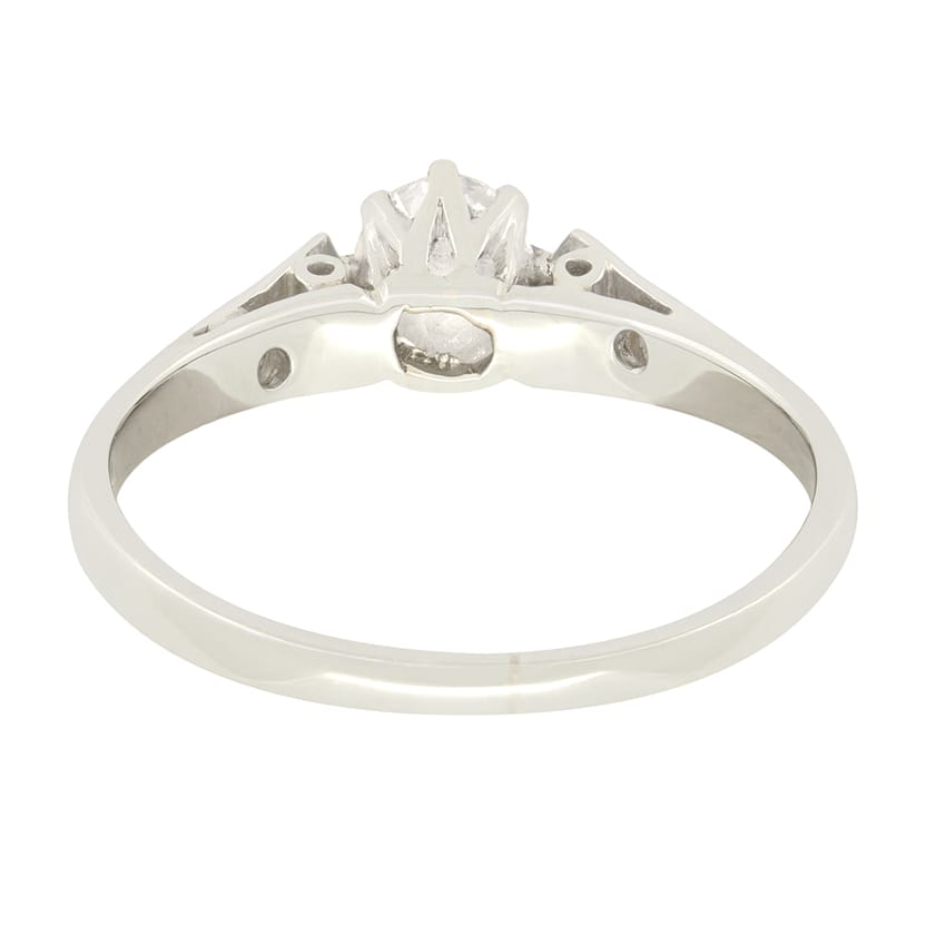 This timeless solitaire engagement ring dates back to the Late Deco era. The charming 0.40 carat central diamond is a transitional cut stone with colour of G and clarity of VS1. Claw set within an 18 carat white gold collet, the diamond is flanked by two small eight cut diamonds which adorn each shoulder, totalling 0.04 carat and adding wonderful extra detail to the piece.