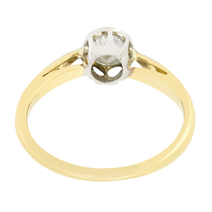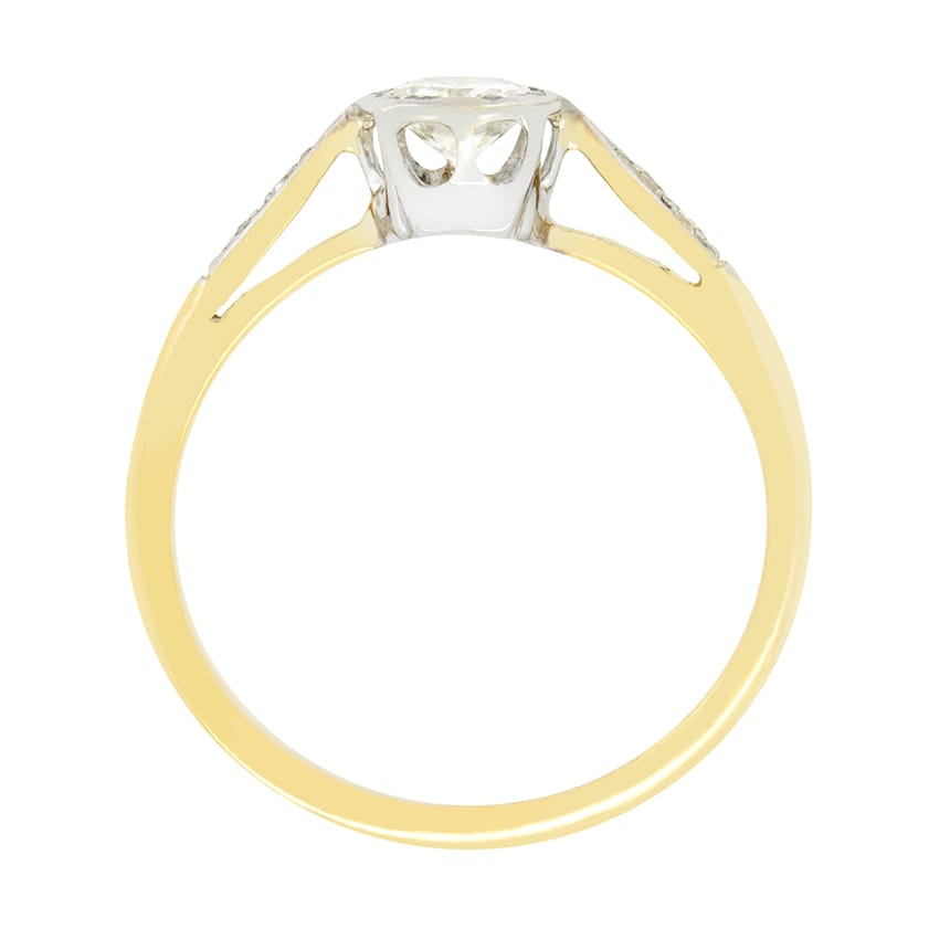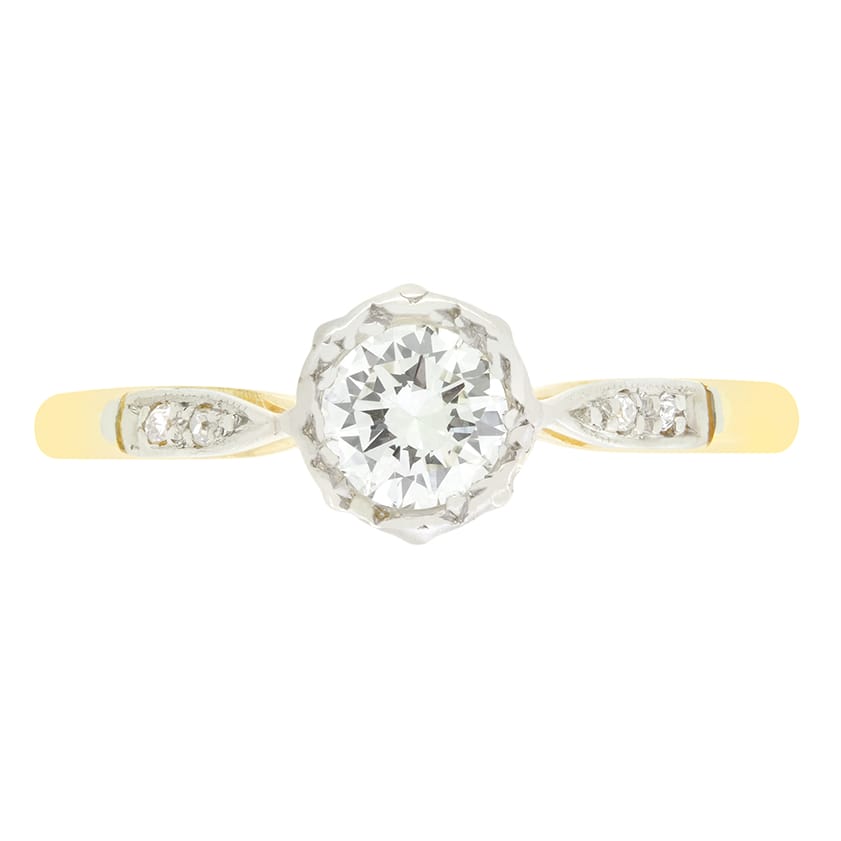 Dating back to the 1940s, this Late Deco solitaire ring is a timeless classic, set with a sparkling transitional cut diamond its centre. Weighing 0.40 carat, the diamond is of good quality with a colour of G and clarity of VS1. Rub over set within an illusion platinum collet the diamond is flanked by two small eight cut diamonds down each shoulder adding wonderful detailing. Also set into platinum these diamonds total 0.04 carat. A contrasting band of 18 carat yellow gold completes the piece.