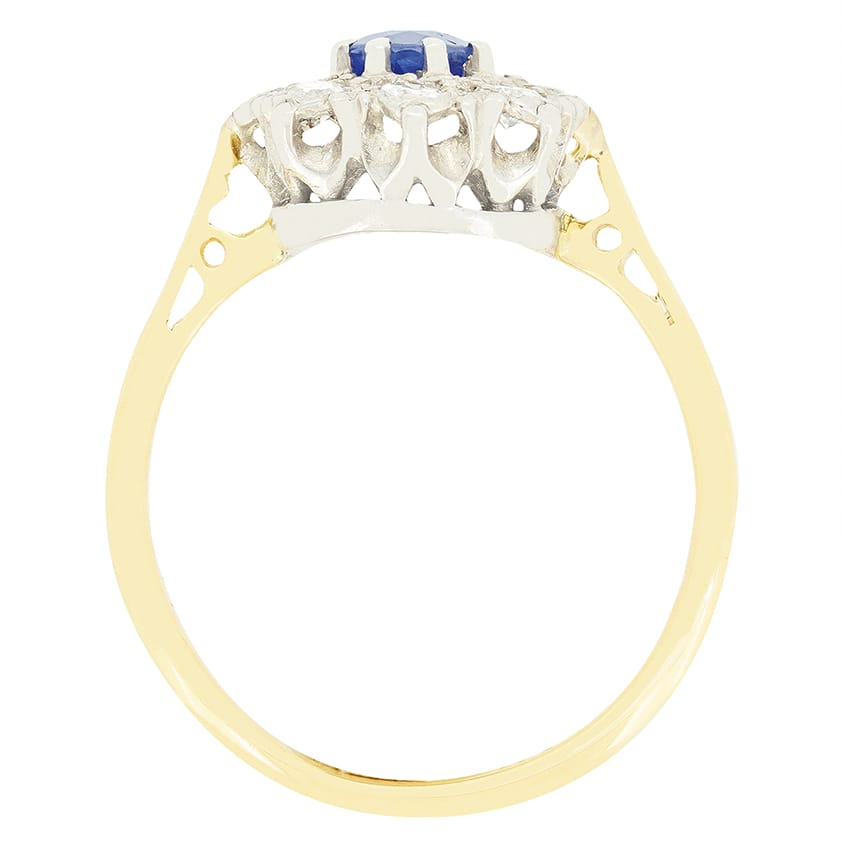 Dating back to the 1940s, this beautiful cluster ring centres around a 0.40 carat blue sapphire. The old cut sapphire is claw set into platinum and surrounded by a cluster of round brilliant diamonds. The diamonds total 0.40 carat with each stone matching in quality at G in colour and VS in clarity. The Platinum head of the ring sits upon a contrasting basket and band of 18 carat yellow gold completing the look.