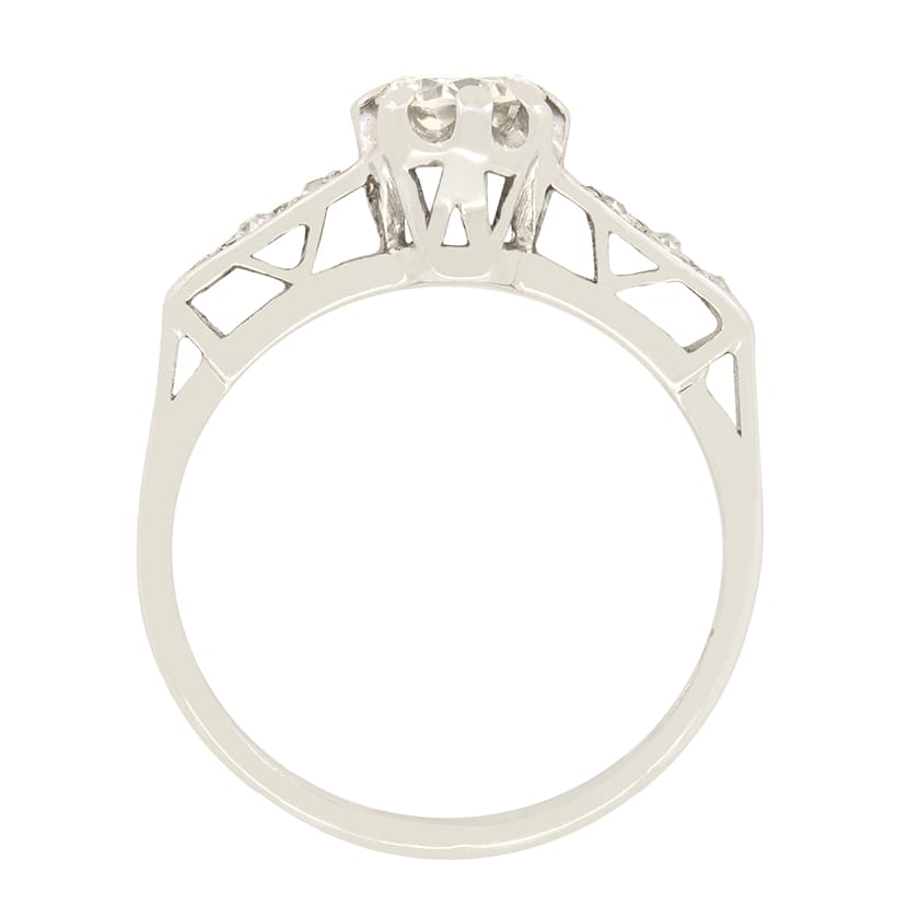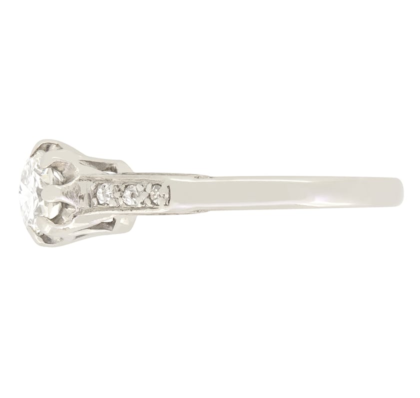 This quintessential Late Deco engagement ring features a single 0.55 carat diamond at its centre, highlighted by elevated diamond set shoulders. The transitional cut diamond is of high quality colour of G and clarity of VS2, and captures the light beautifully. Three old cut diamonds are set on each shoulder, totalling to 0.12 carat. Crafted entirely in platinum this is a truly timeless solitaire ring.