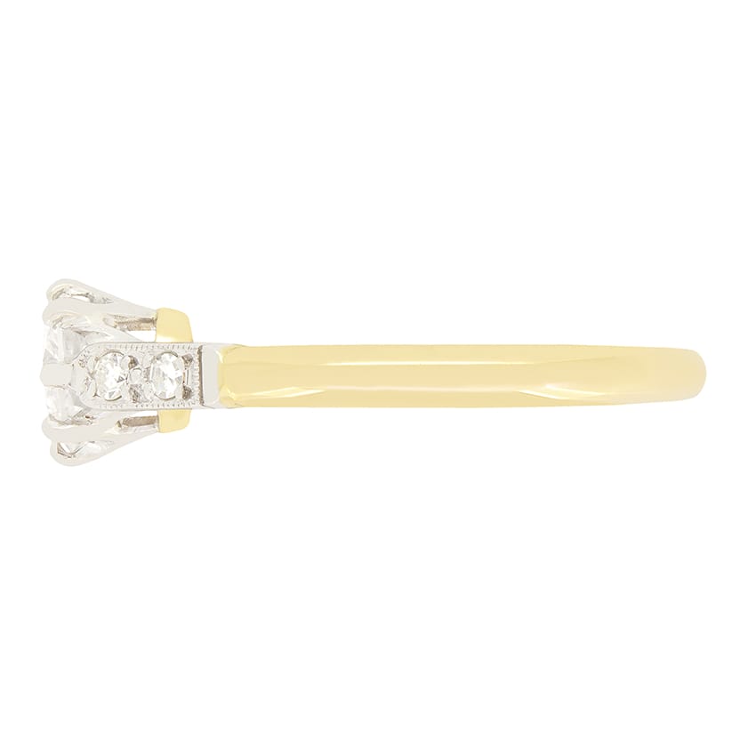 Dating back to the 1940s is this Late Deco solitaire ring features a 0.70 carat, transitional cut diamond as the showpiece. The diamond has a colour of G and a clarity of SI2 and is claw set into a platinum collet. Flanking the central diamond, an additional four eight cut diamonds are set, two on each platinum shoulder. These diamonds total 0.12 carat and add real character to the classic design. A band of 18 carat yellow gold finishes off the piece beautifully.