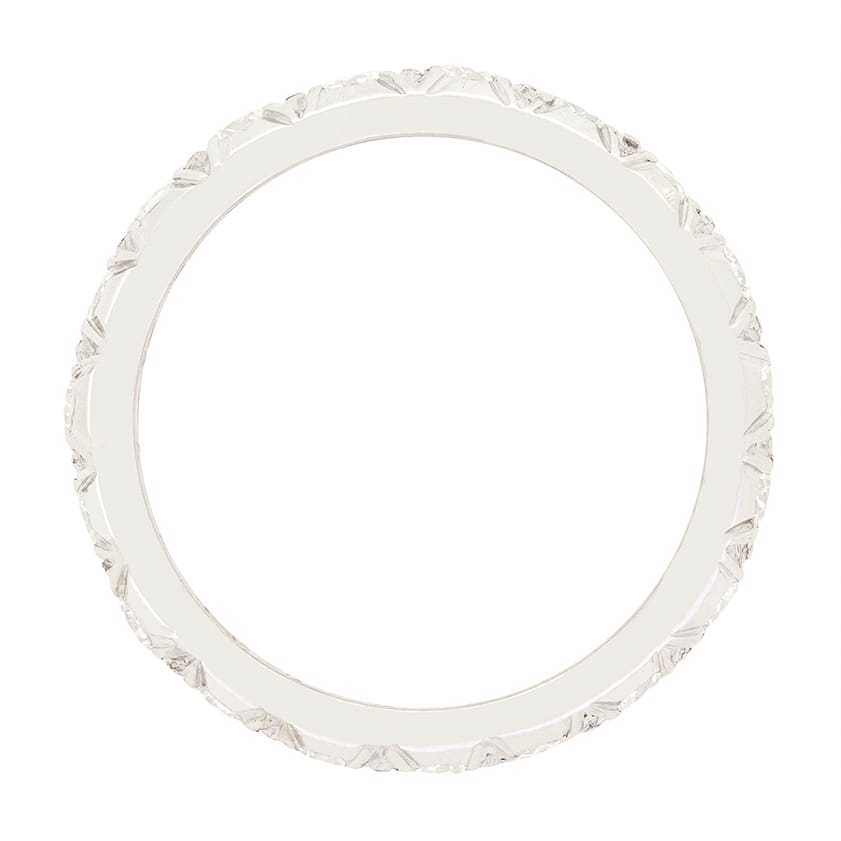 This stunning Late Deco full eternity ring features a total of 19 round brilliant diamonds, each weighing 0.04 carats for a total of 0.76 carats. The glittering diamonds all match in quality at G in colour and VS in clarity. Each stone has been delicately claw set into a band of platinum for a clean and timeless look.