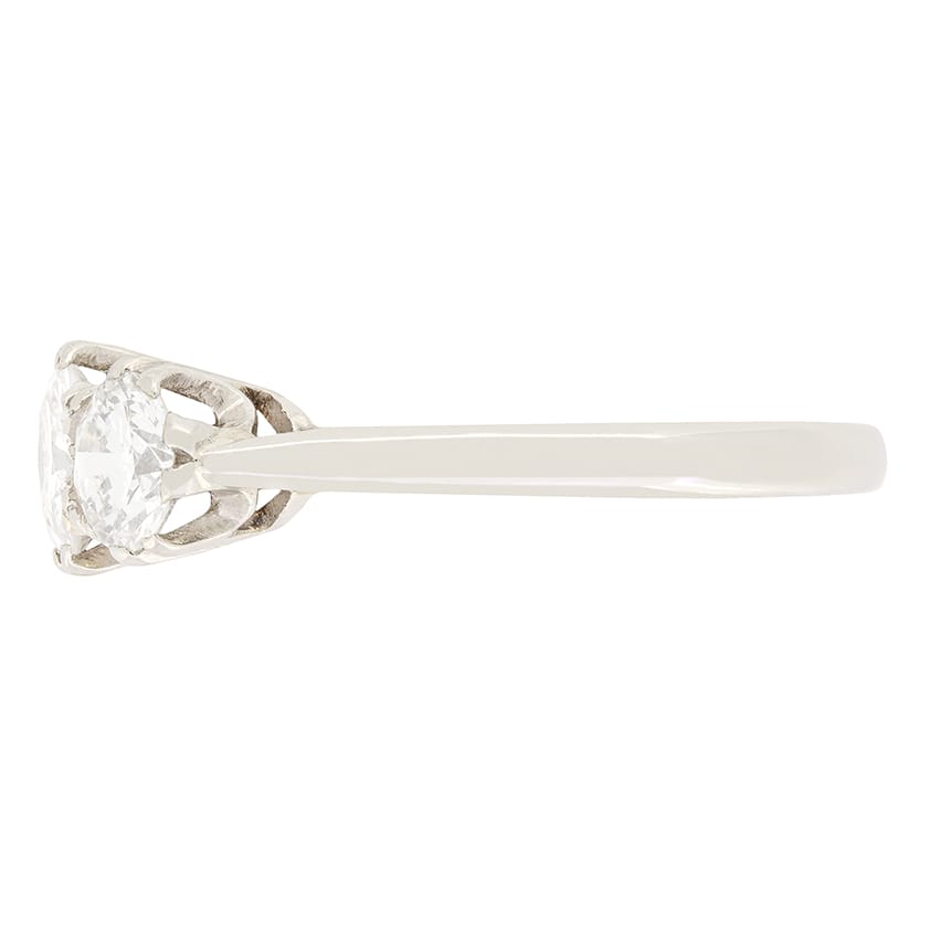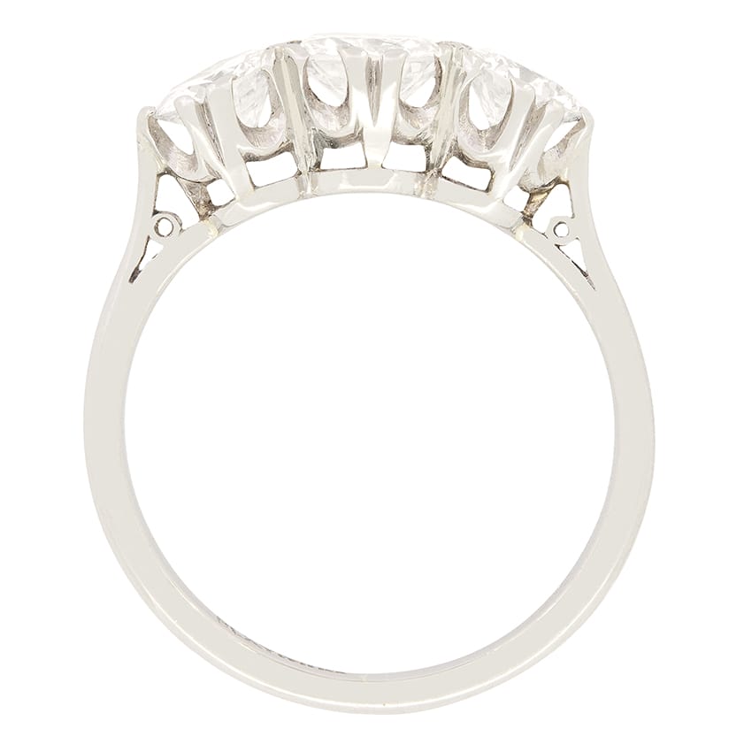 This stunning trilogy was crafted in the late Art Deco period, and features three glistening transitional cut diamonds. The centre diamond is 0.60 carat, while the flanking pair are 0.40 carat each. The diamonds are G to H in colour, and VS to SI in clarity, capturing the light beautifully. They are held within platinum claw settings, which match the rest of the timeless setting style.