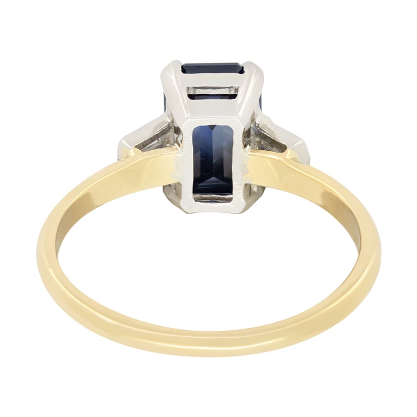 A real eyecatcher, this unique Late Deco solitaire ring holds an impressive 2.80 carat sapphire as it’s centrepiece. An emerald cut stone, this deep blue sapphire is completely natural and unheated. The gem is claw set into a platinum collet with a pair of baguette cut diamonds sitting either shoulder. The diamonds are 0.05 carat a piece, for a total of 0.20 carat. They all match in quality at F in colour and VS in clarity. A contrasting band of 18 carat yellow gold completes this stunning ring.