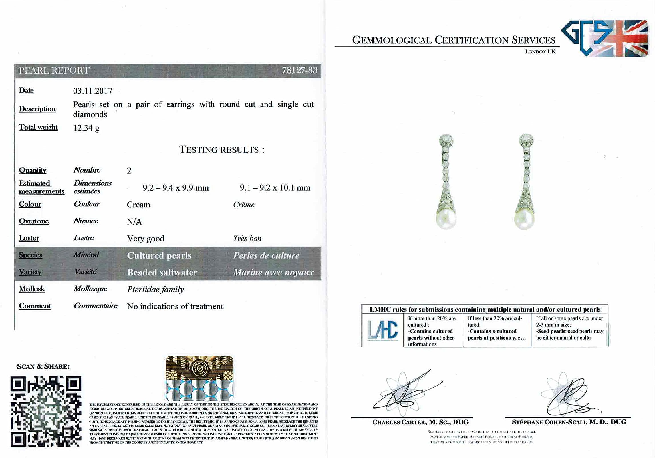 The bottom of the earrings are expertly finished with wonderfully white cultured pearls. The each measure 9.1mm and hand majestically. The pearl has been independently certified by renowned lab GCS. The earrings come within original box, an added bonus, and they have a clip setting on the back. Ideal, making this piece suitable for those with and without pierced ears.