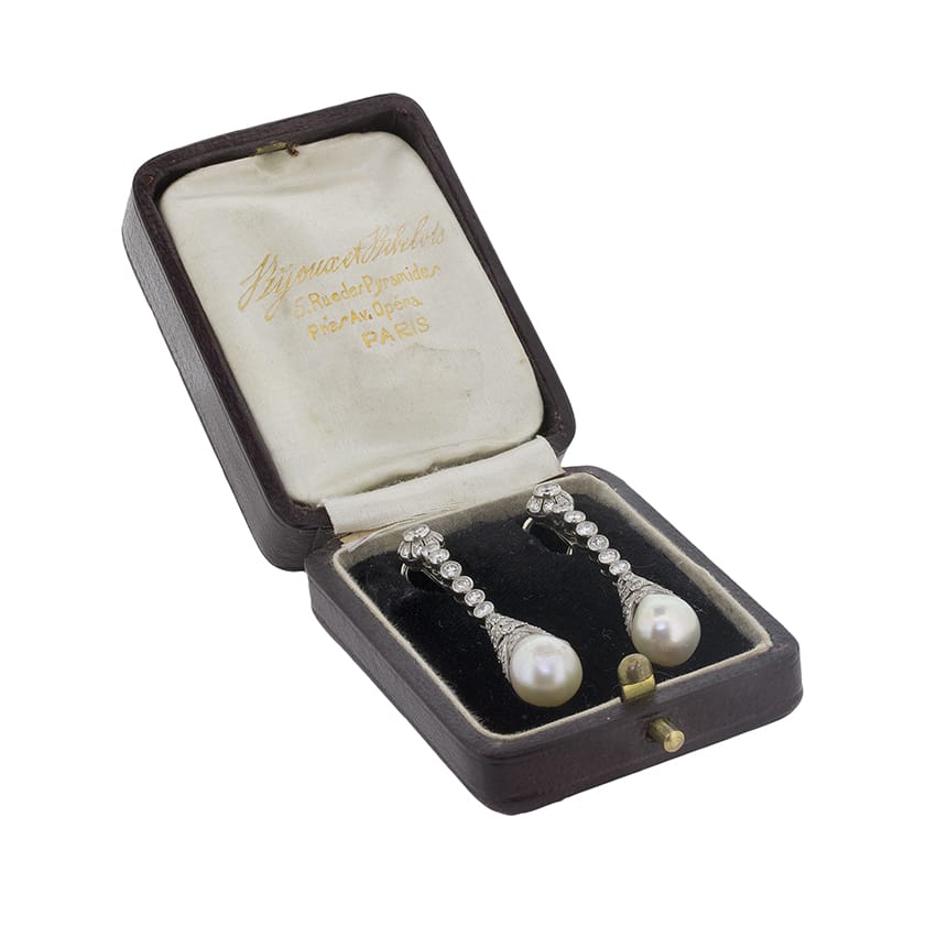 These earrings have a near level of perfection, from the beautiful floral cluster design at the top, to the accuracy of the millegrain edging encapsulating the diamonds. The setting work is all made of platinum.