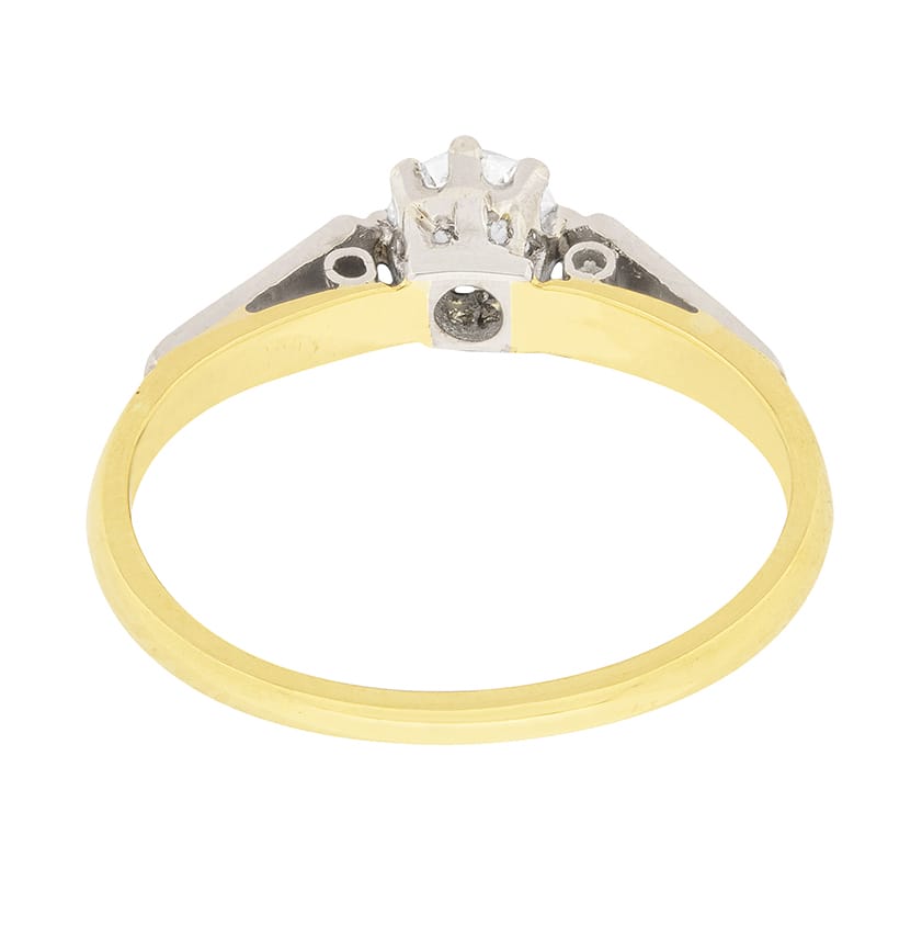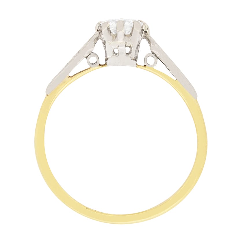 A classic diamond solitaire, this engagement ring features a 0.40 carat diamond in the centre. It is a round brilliant diamond estimated as an F in colour and SI in clarity. It has been claw set within platinum and the shoulders, also in platinum, have been bark finished. The cheniers are also in platinum, whilst the shank has been made in 18 carat yellow gold.