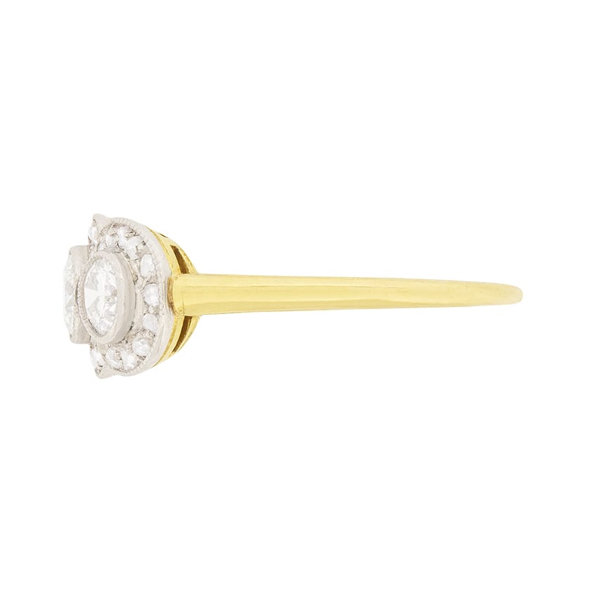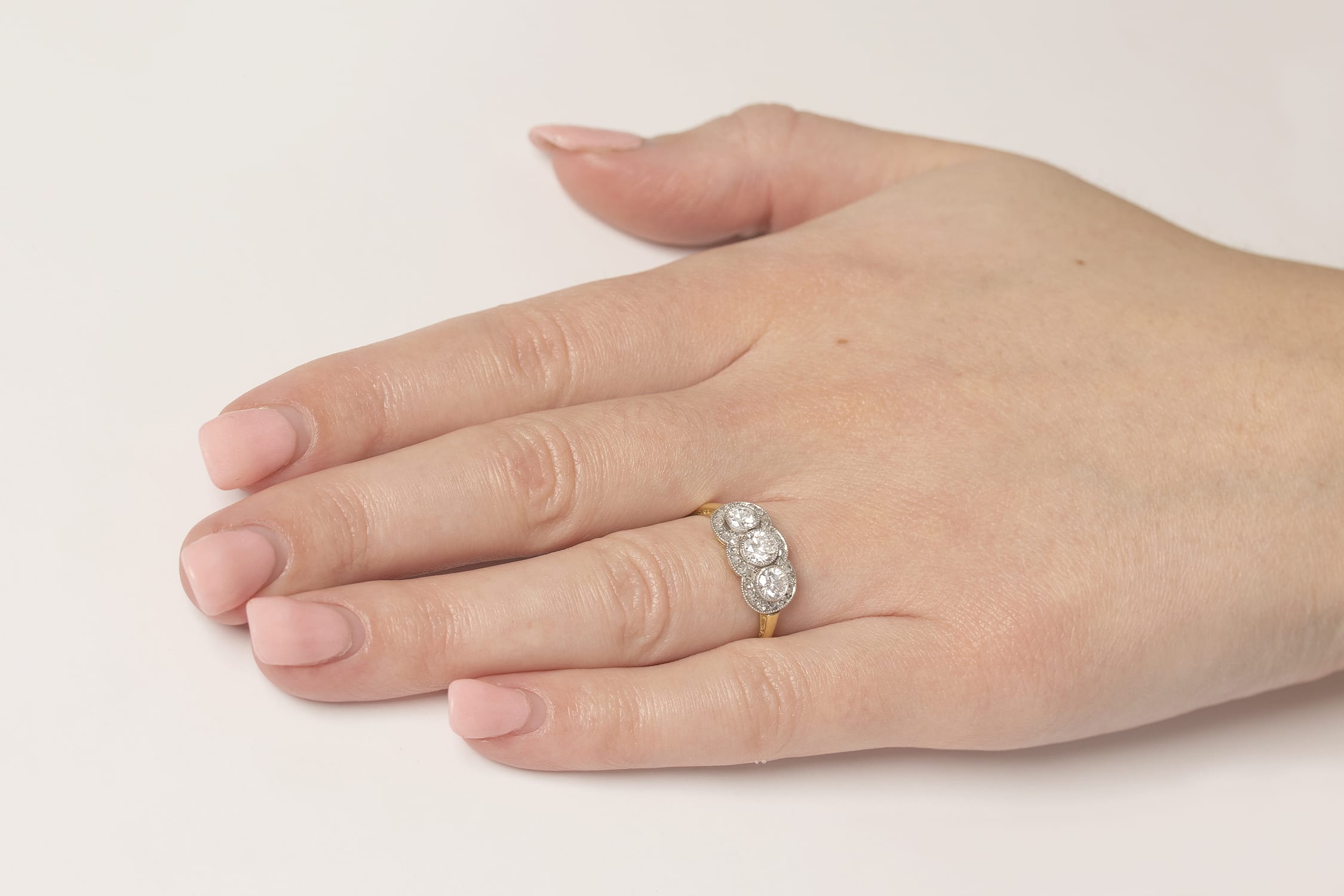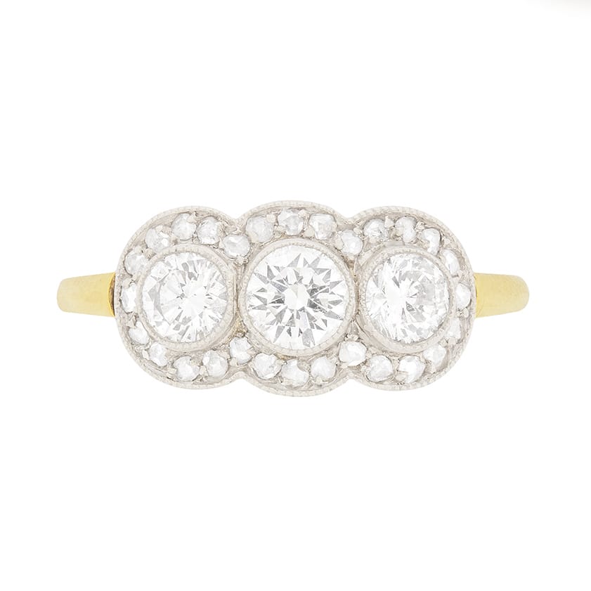 Three round brilliant diamonds are surrounded by a delicate diamond halo. The centre stone weighs 0.35 carat whilst the two adjacent each weigh 0.30 carat each. The diamonds match in quality, estimated as G in colour and VS2 in clarity. The halo features rose cut diamonds, which have been grain set within platinum. The gallery and shank have been made in 18 carat yellow gold. The shoulders have been finished with beautiful engraving, giving this ring an abundance of detail.