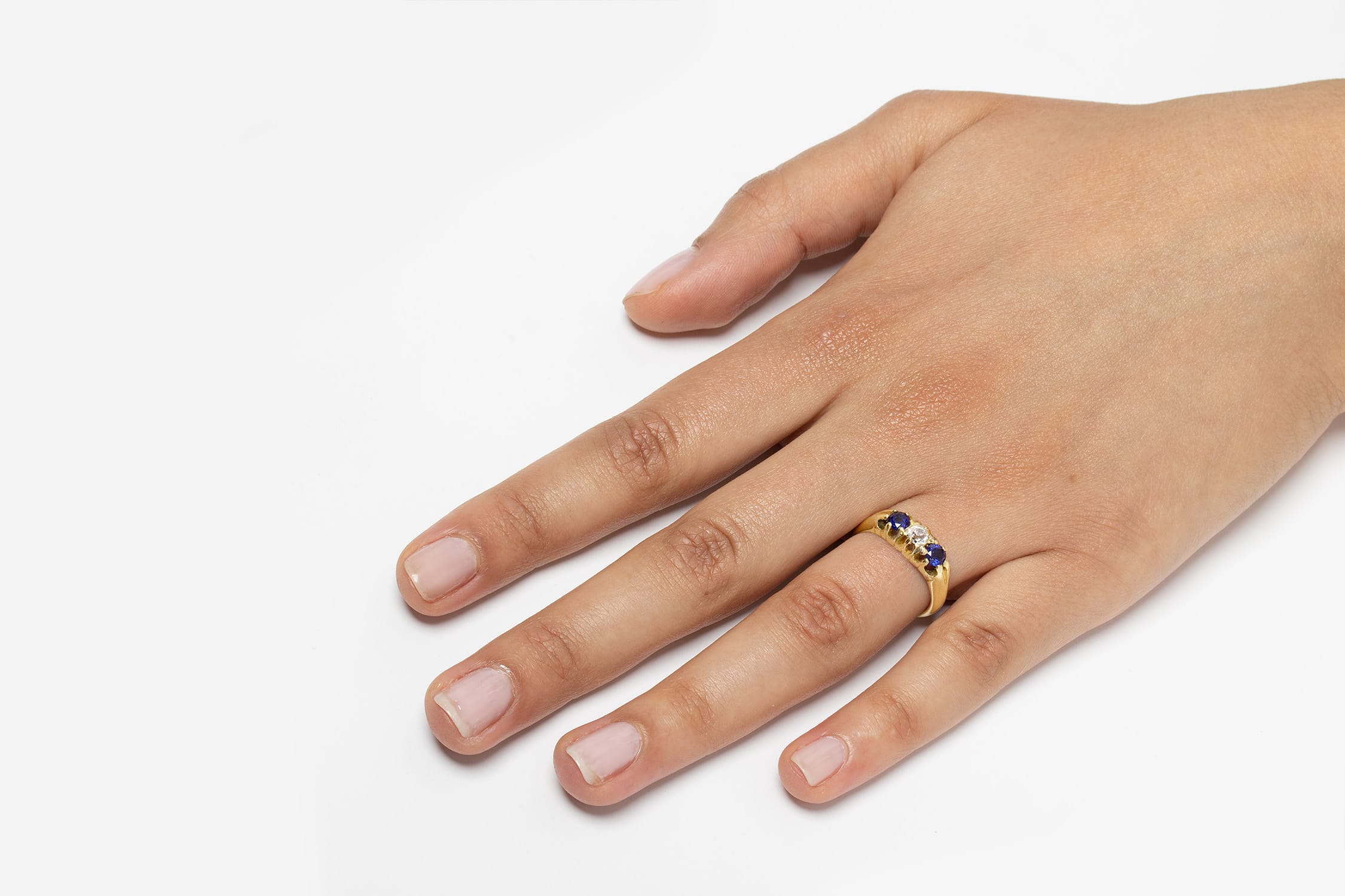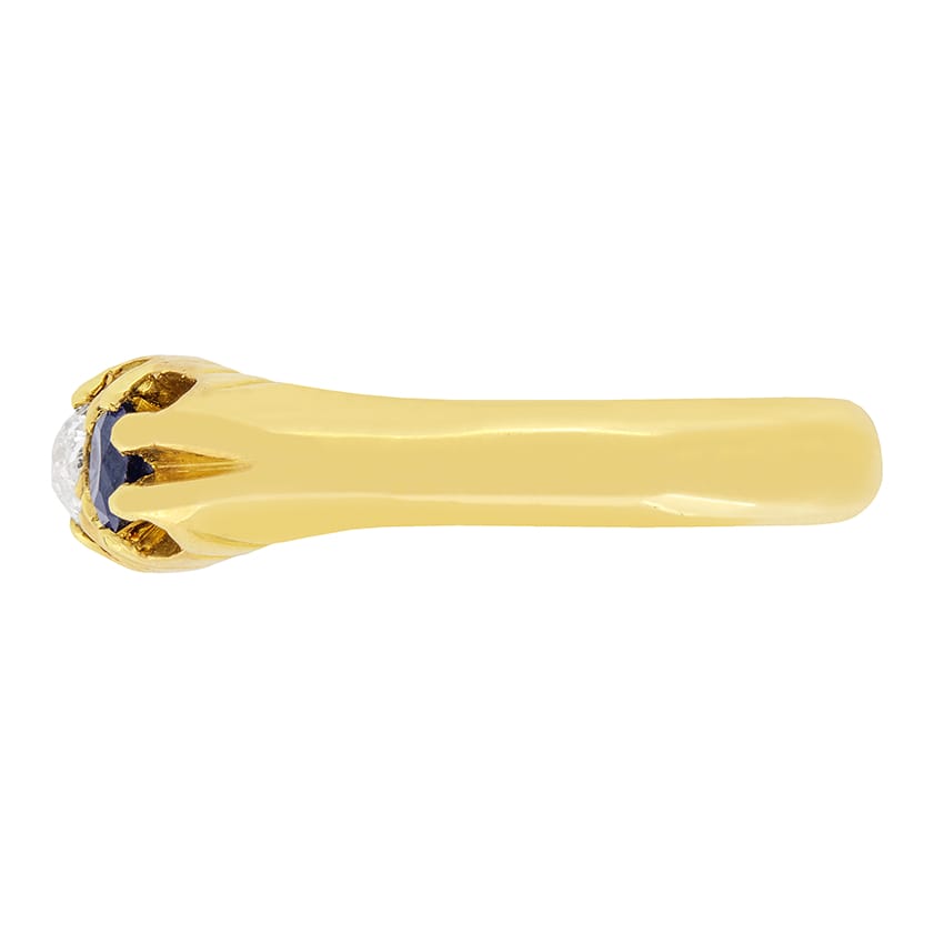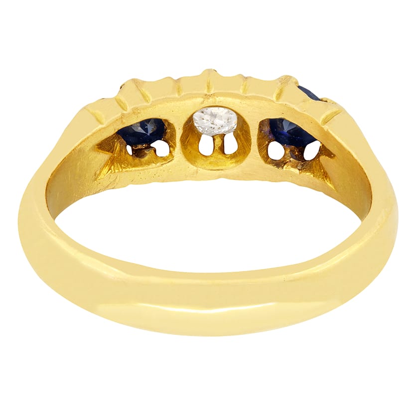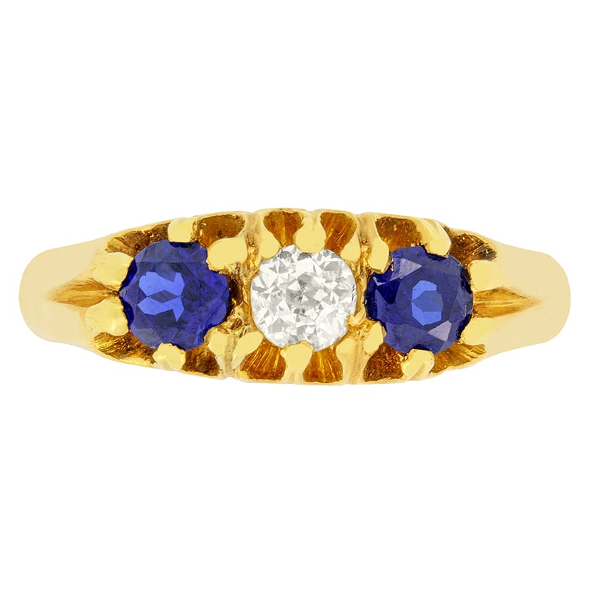 Dating back to the Late Victorian era is this charming diamond and sapphire three stone ring. In the centre sits a 0.30 carat old cut diamond followed by two 0.30 carat blue sapphires, one to either end. The diamond has been estimated as G in colour and SI1 in clarity which balances perfectly with the vivid sapphires. All three stones have been set into an open claw 18ct yellow gold ring which is hallmarked c.1903.