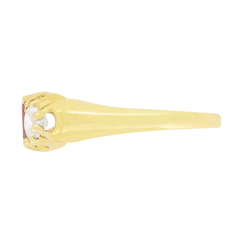 Sat between two 0.40 carat old cut diamonds is an oval shaped ruby, weighing 0.50 carat. The matching diamonds on either side have been estimated as H in colour and VS-SI in clarity. The three stones have been claw set into a classic Victorian setting, hand crafted in 18ct yellow gold.