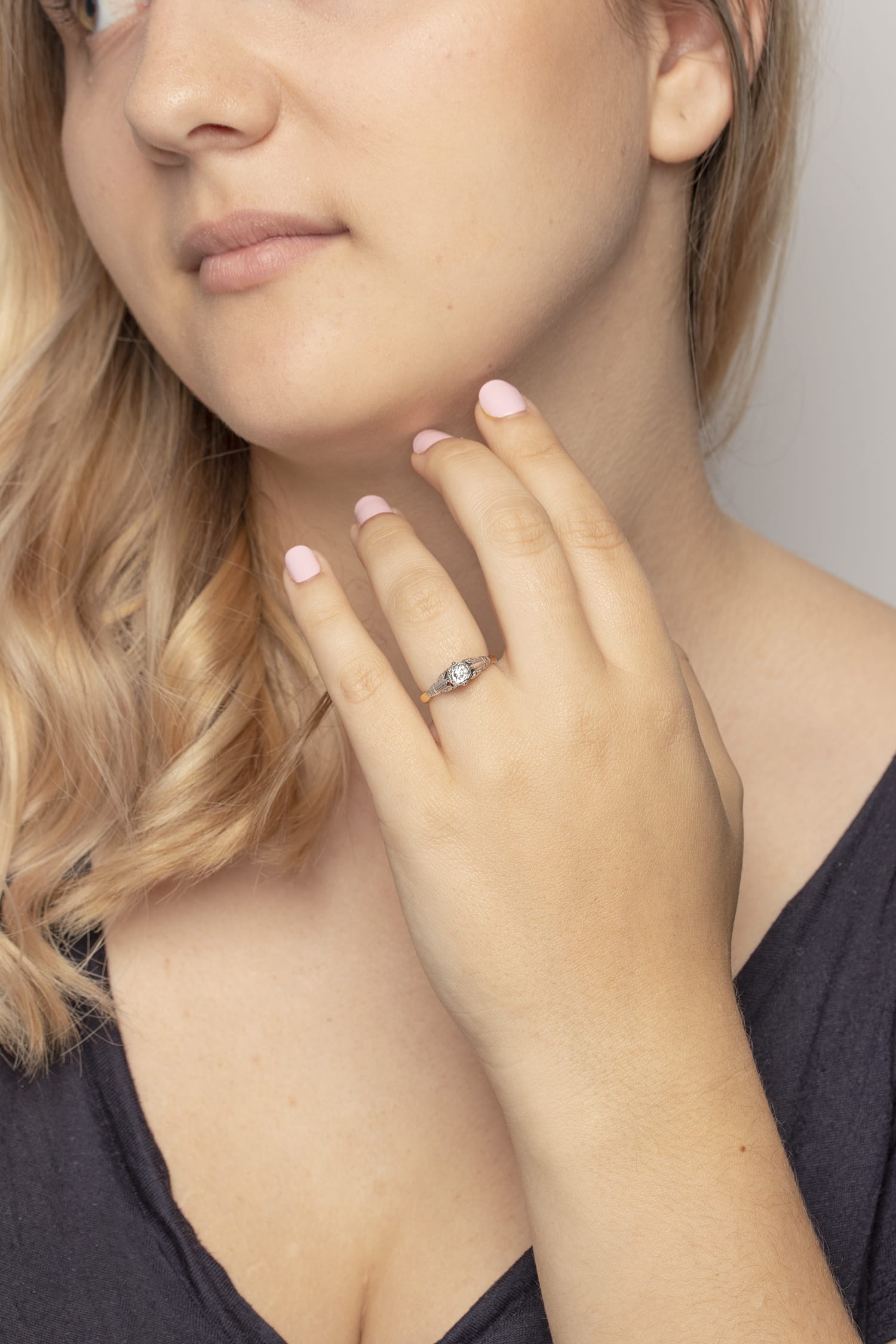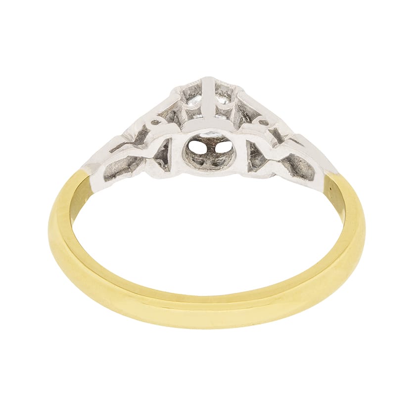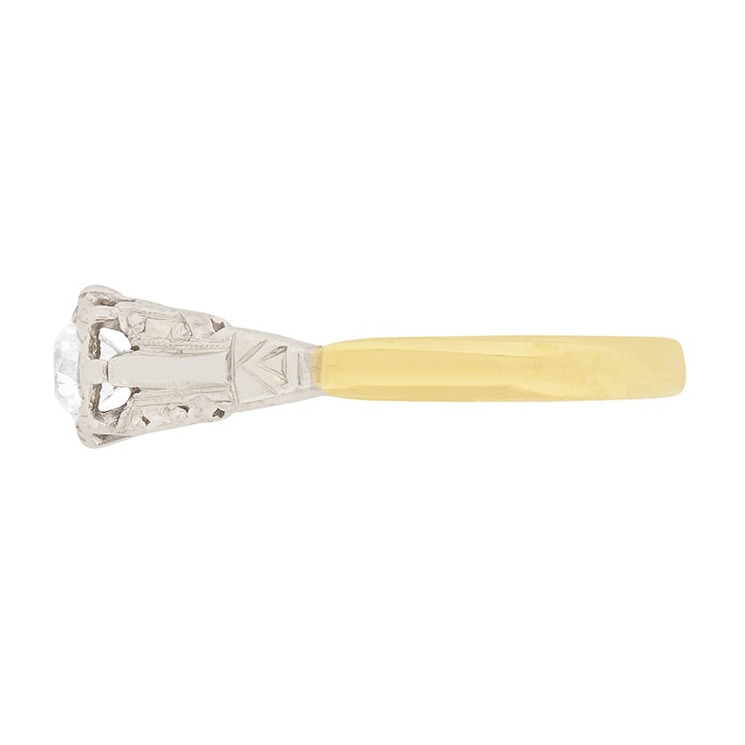 This delicate solitaire highlights a 0.30 carat diamond within an illusion setting. The diamond is I in colour and VS1 in clarity and the intricate platinum collet and shoulders have been handmade. The shank is made from 18 carat yellow gold and the whole ring dates to the 1900s.