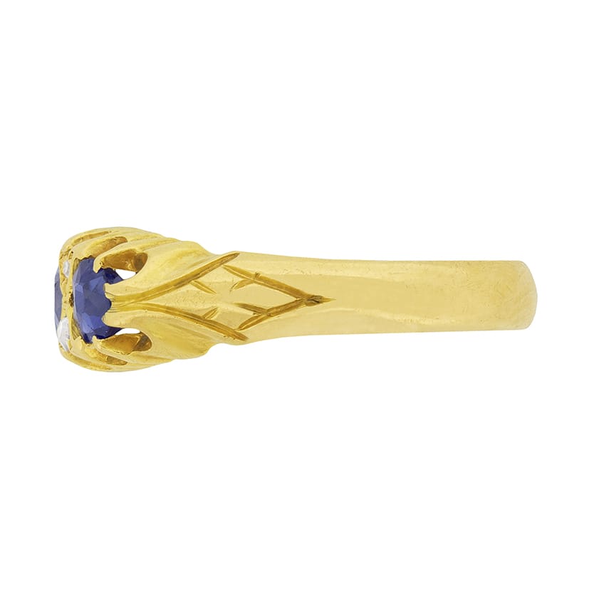 This late Victorian era sapphire and diamond ring was handmade in 18 carat yellow gold at the beginning of the 1900s. It features a claw set trio of oval-shaped sapphires in graduated sizes that alternate with vertically-arranged pairs of old cut diamonds. The wonderfully deep blue sapphires have a combined weight of 0.40 carat and the centre gemstone is surrounded by little old cut diamonds. They have a combined weight of 0.08 carat and are H in colour, SI in clarity. The ring’s original period setting features design hallmarks of its era, which include raised claw settings and hand-carved shoulders.