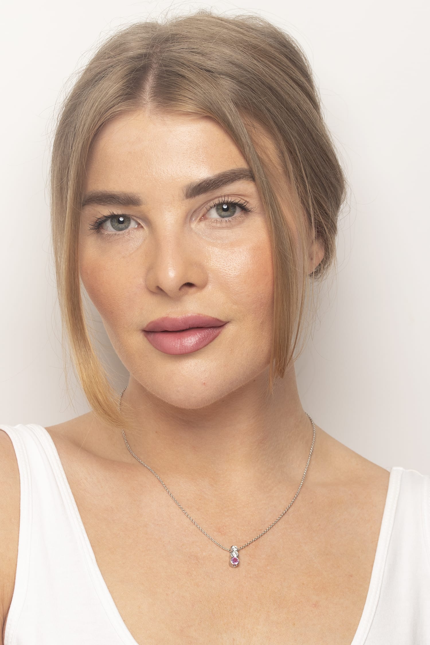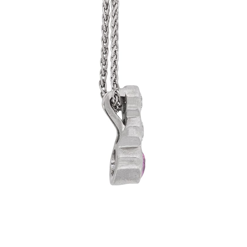This drop necklace features two diamonds at the start of the drop, finished by a wonderful pink sapphire. The top diamond weighs 0.20 carat, and the second is slightly bigger at 0.25 carat. They are estimated to be G in colour and VS in clarity, making them truly dazzle alongside the pink sapphire. The sapphire weighs 0.50 carat, and is a lovely pale pink. The stones are all rub over set, making them secure and the setting work is made of 18 carat white gold. Simplistic is style, but elegant and perfect for day or night wear.