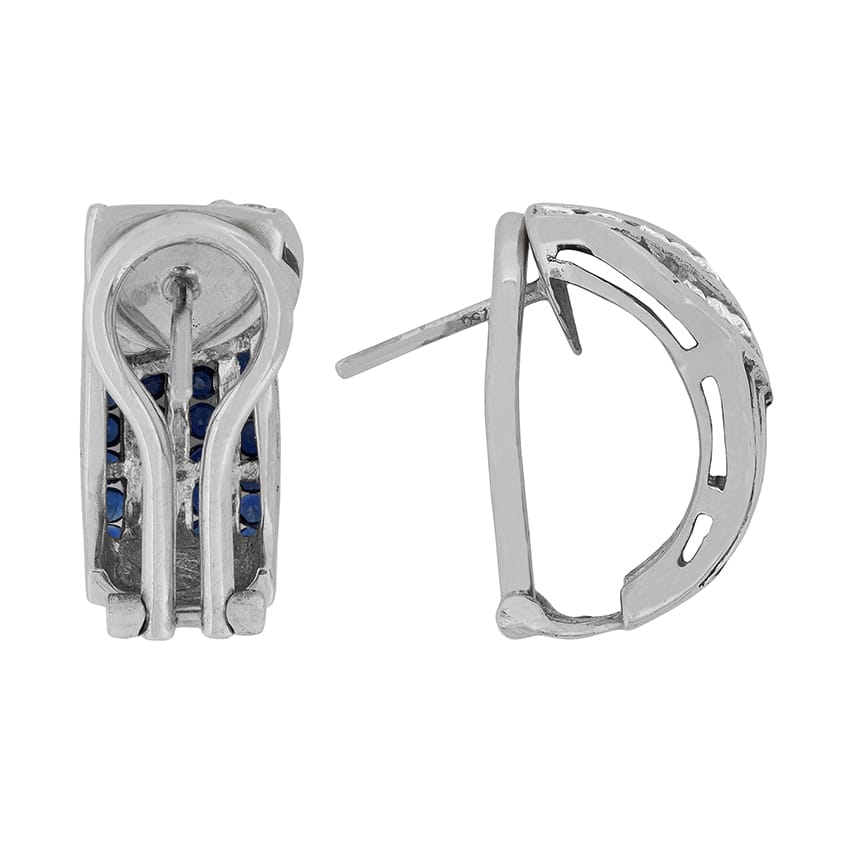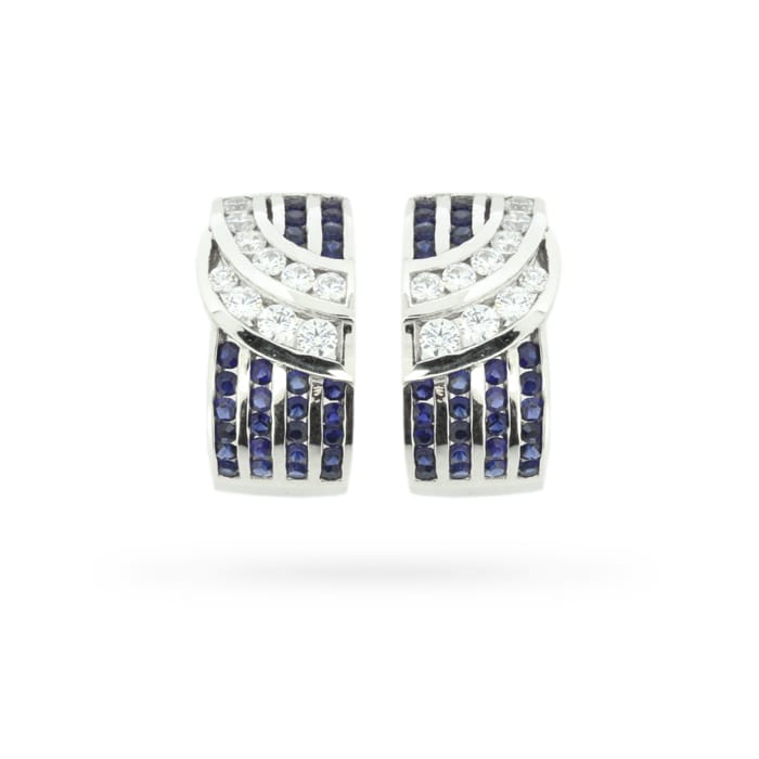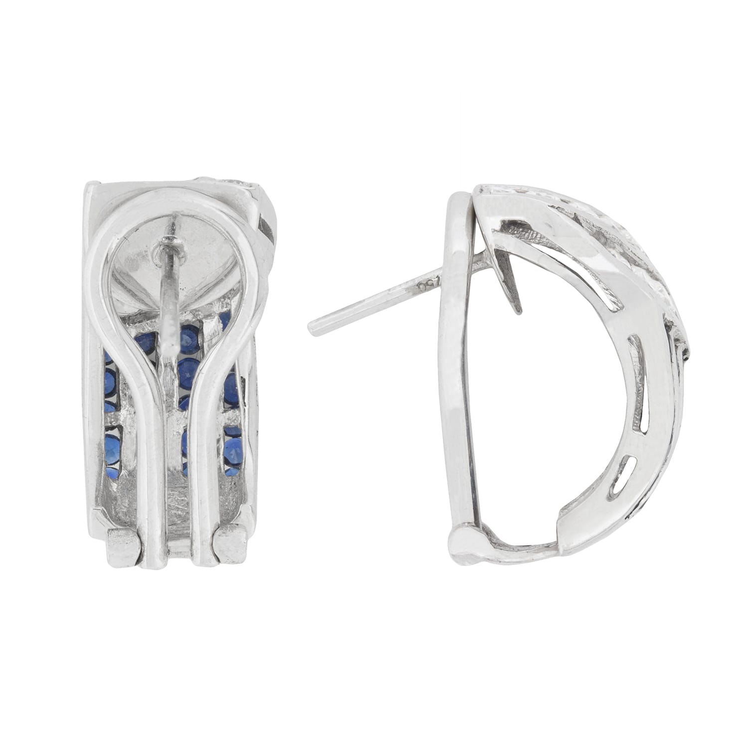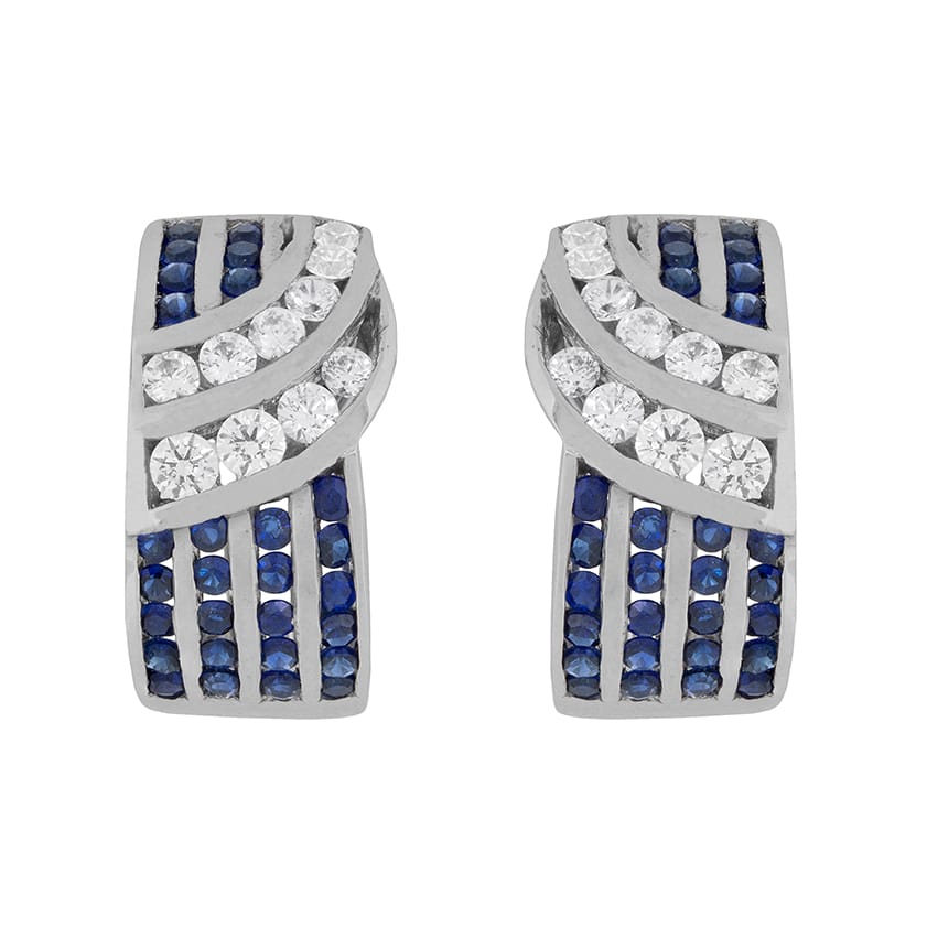 A pair of modern sapphire and diamond earrings with a decidedly retro flair! Crafted in 18 carat white gold with secure stud and clip hinge fittings, these lovely earrings feature four vertical, channel set rows of brilliant blue sapphires intersected on the diagonal by two glimmering, well-matched, channel set rows of round brilliant cut diamonds of an exceptional F colour and VS clarity. The diamonds have a combined weight of 0.84 carat, and the sapphires total 0.82 carat.
