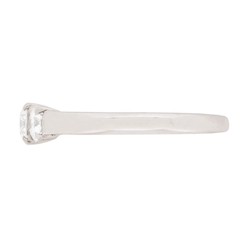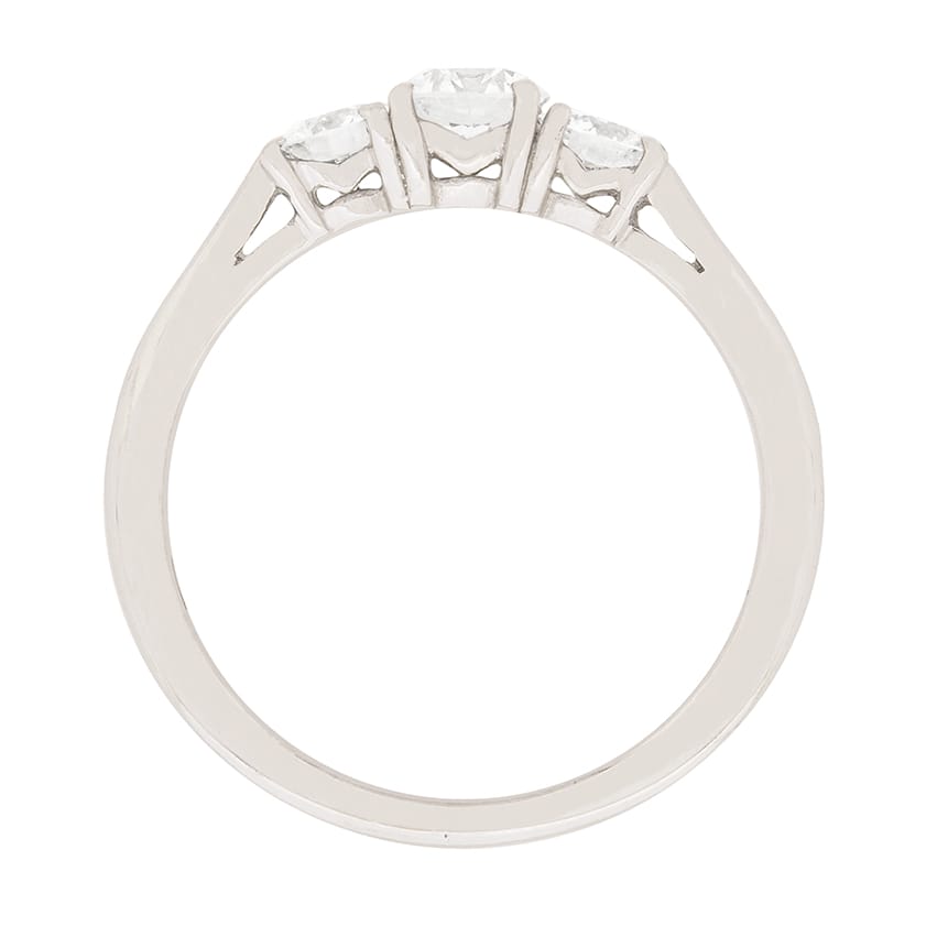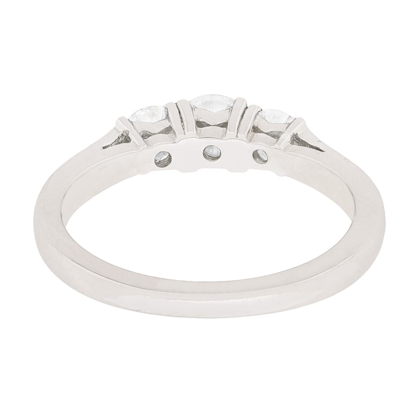 This modern ring features three stunning round brilliant diamonds. The centre diamond weighs 0.35 carat and the two adjacent diamonds are 0.20 carat each. They all match in quality, F in colour and VS1 in clarity. The centre stone is slightly raised above the other two and they are set within claws. The mount has been made from platinum.
