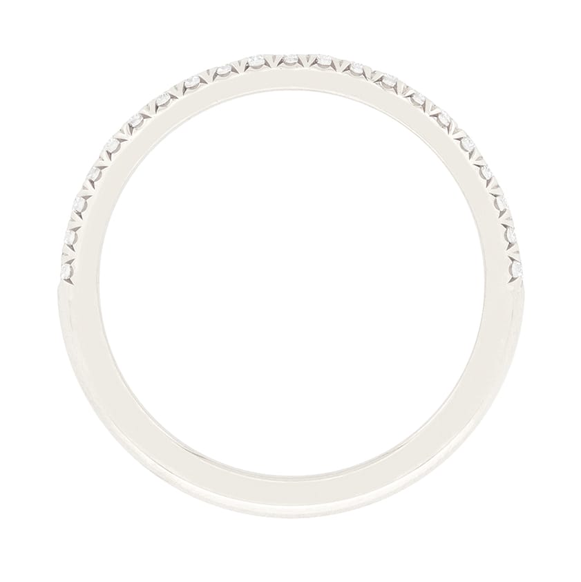 This classic half eternity band is part of Tiffany & Co.’s ‘Soleste’ collection. This band is crafted in platinum and is micro set with 0.17 carat of round brilliant cut diamonds. They are excellent quality, matching at F in colour and VVS in clarity. The ring has all original Tiffany & Co. hallmarks and comes in a Tiffany & Co. box.