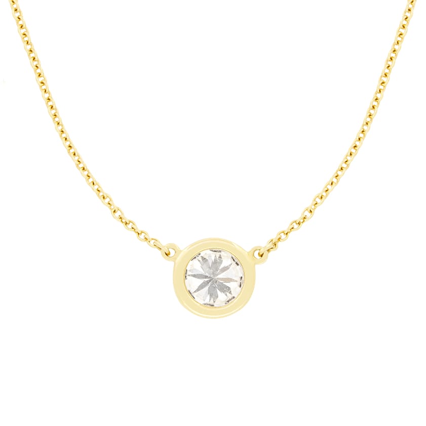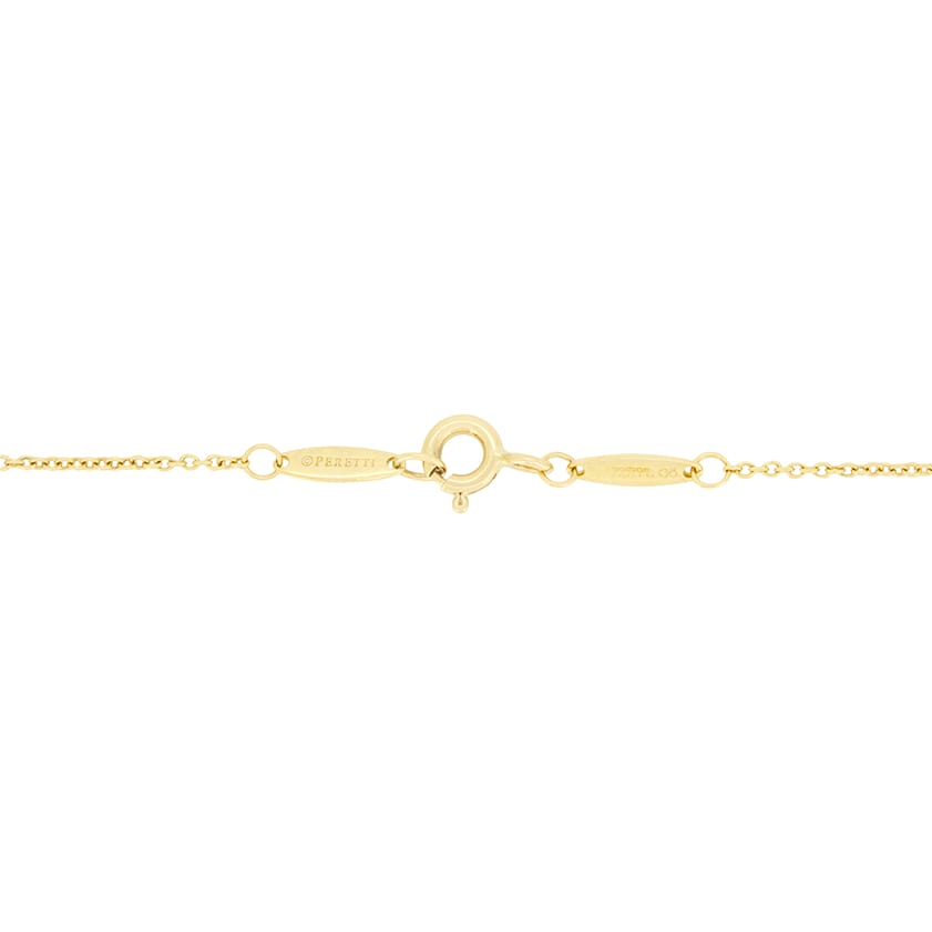 This elegant Tiffany & Co. Elsa Peretti pendant comes from their iconic ‘Diamonds by the Yard’ collection. A littering 0.73 carat diamond sits star of the show, rub over set in 18 carat yellow gold. The diamond boasts an exceptional grading of E in colour and SI1 in clarity. The pendant is suspended gracefully from a delicate 16″ chain, for the perfect everyday wear. The Tiffany & Co. maker’s marks adorn the clasp, ensuring authenticity.