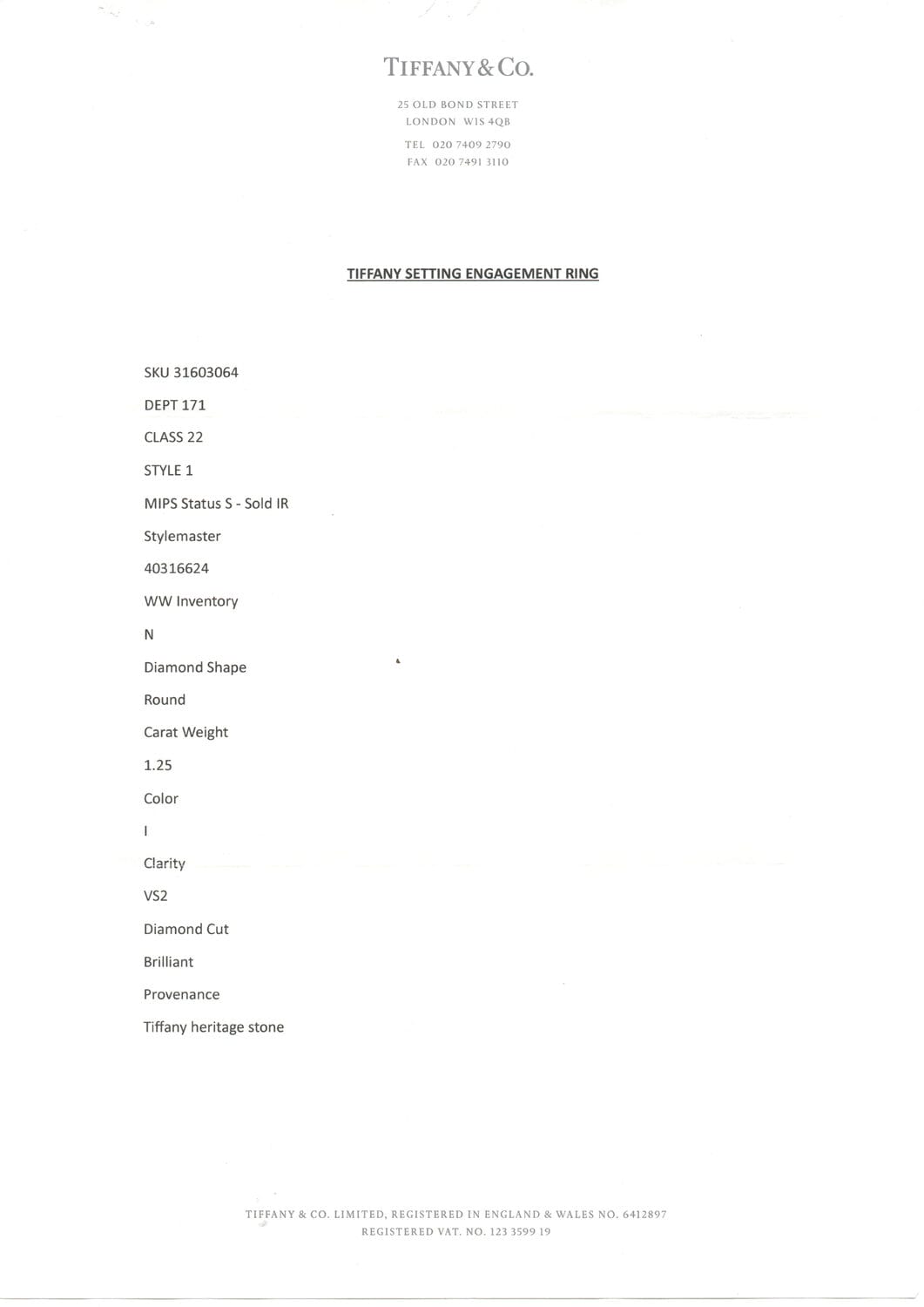 From Tiffany & Co. comes this iconic knife edge solitaire, featuring a stunning 1.25 carat round brilliant diamond. The Diamond has been graded I in colour and VS2 in clarity and is claw set within platinum. The band is crafted of the same metal with all the original Tiffany & Co. hallmarks around the inside of the band. This beautiful ring comes with its original box but no original certification.