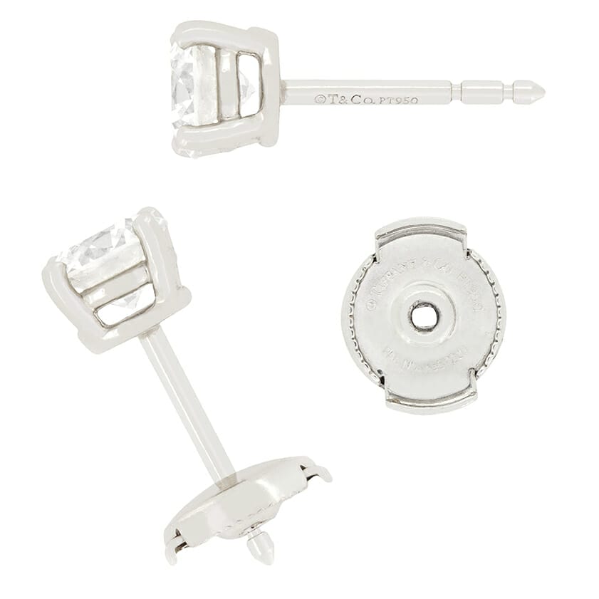 This pair of classic Tiffany & Co. earrings featuring two beautiful diamonds weighing 0.72 carat a piece. As would be expected from Tiffany & Co., both diamonds are incredibly high quality being graded as G in colour and VS1 in clarity. They are claw set within platinum with makers marks on both the post and the la pousette style backs. They also come in a Tiffany & Co box.
