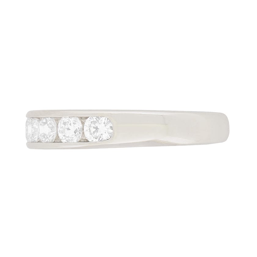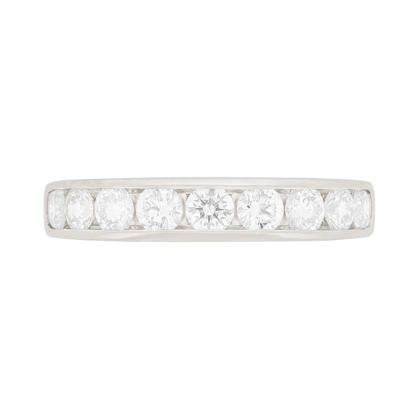 This classic Tiffany & Co half eternity ring is channel set halfway around in platinum with a single row of round brilliant cut diamonds. As would be expected from this acclaimed jeweller, the diamonds are well-matched, full of fire and have been graded to a desirable F colour and VS clarity. A stylish choice to accompany a diamond engagement ring from your wedding day onwards, or to mark a special anniversary, this authentic, pre-owned ring is signed ‘Tiffany & Co.’ with the appropriate makers marks.