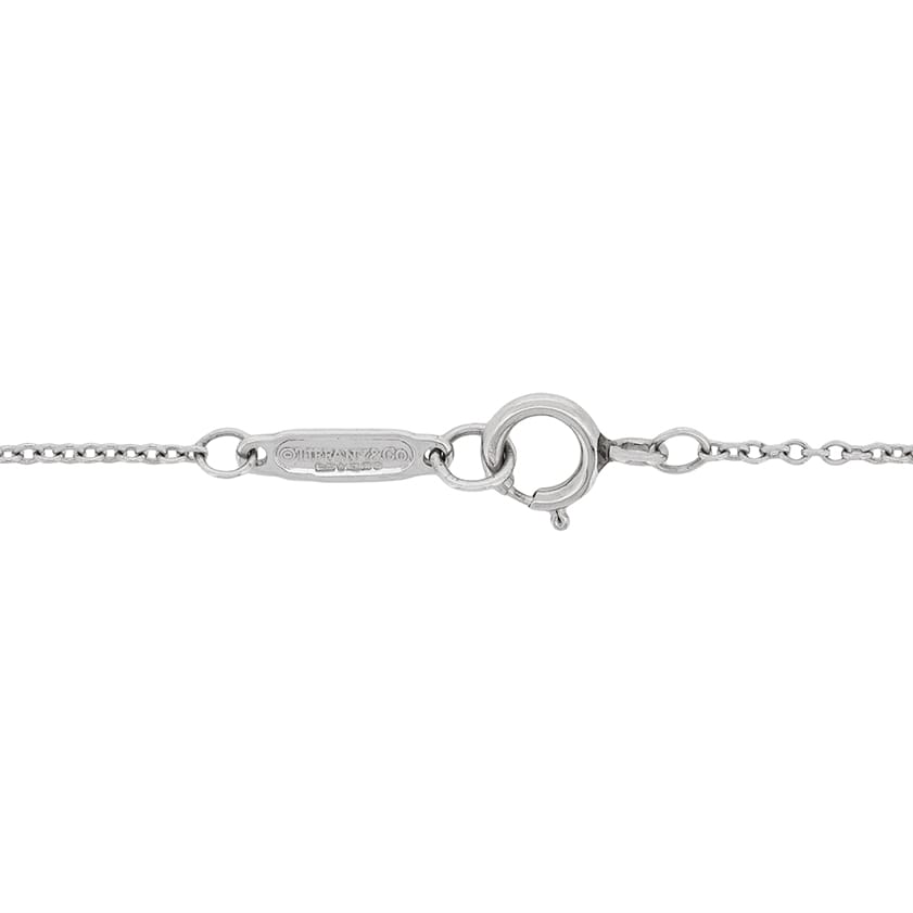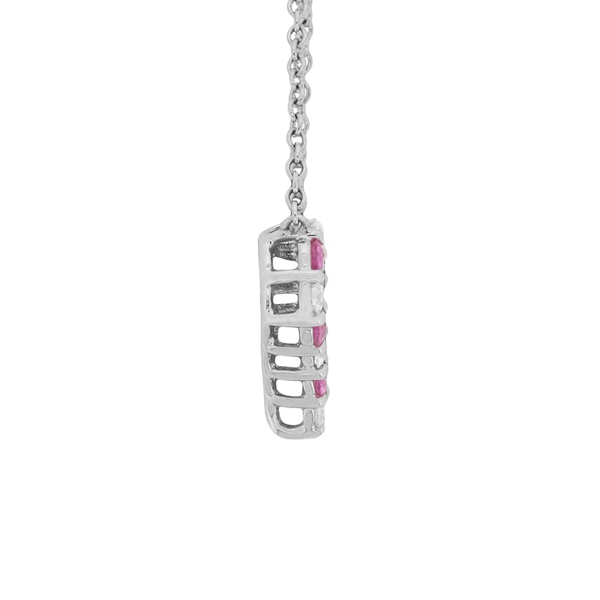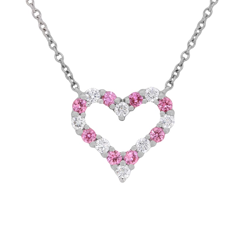 This lovely necklace is from designer Tiffany & Co. There are claw set diamonds and pink sapphires, alternatively set within the heart shape. There is a combined weight of 0.29 carat; 0.14 carats of sparkling diamonds, and 0.15 carats of bright pink sapphires. The diamonds are of a high quality, and graded as F in colour and VS in clarity. The chain is original to the piece and the setting and chain are made of platinum. The piece has original Tiffany & Co makers marks.