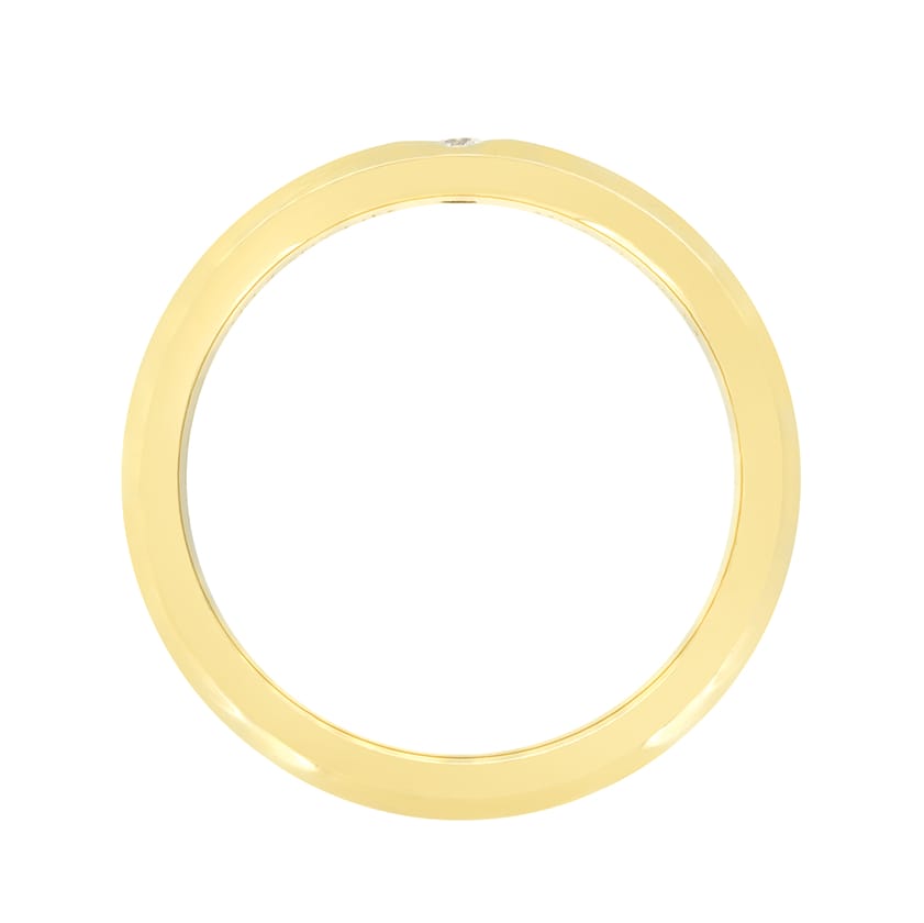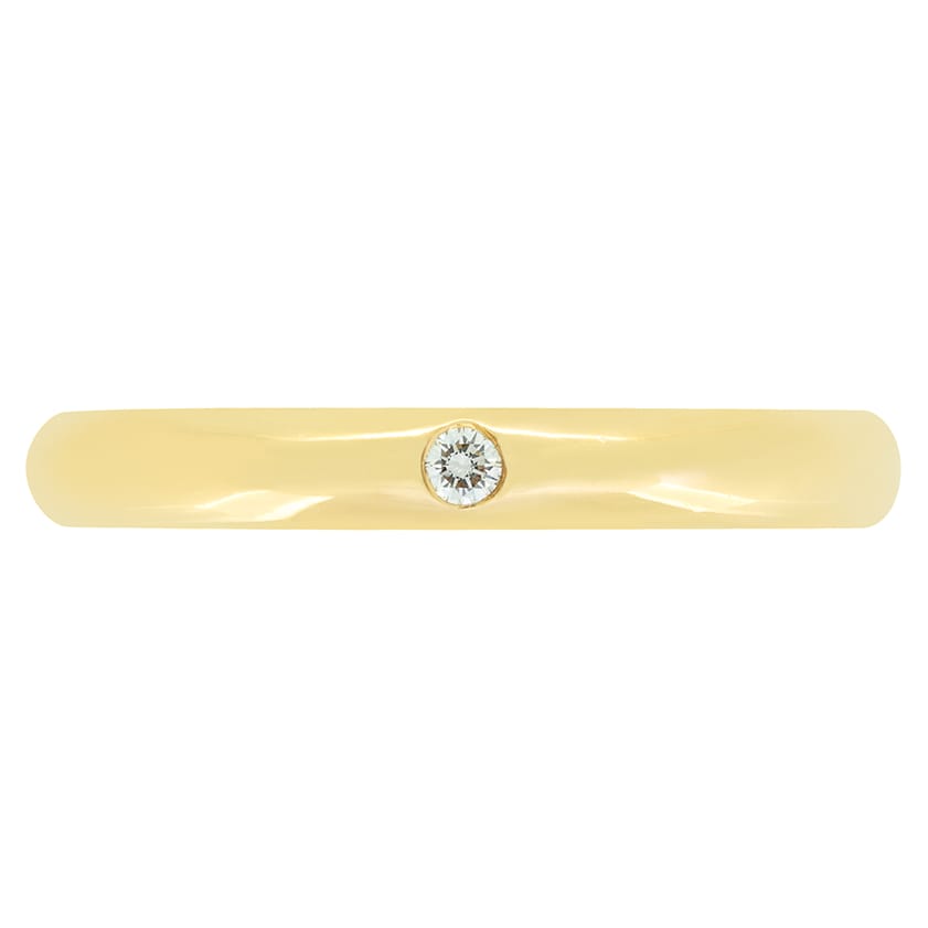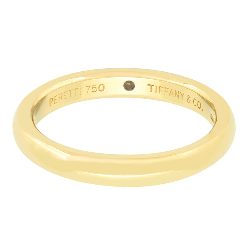From the designer Tiffany & Co. comes this diamond set band from their Elsa Peretti collection. The 2,7mm wide band has been crafted in 18 carat yellow gold and features a single round brilliant diamond at its centre. The diamond weighs 0.02 carat, with colour of F and clarity of VVS. The original Tiffany & Co. hallmarks can all be seen along the inside of the band.