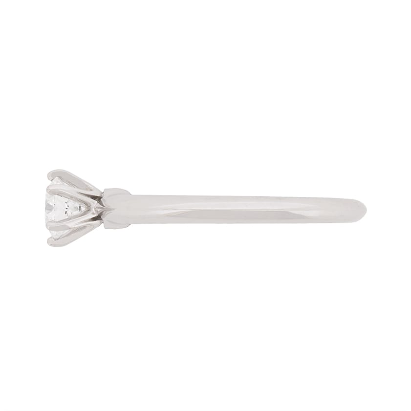 A classic engagement ring from Tiffany & Co. It centres a round brilliant diamond which weighs 0.45 carat. It has a certificate from Tiffany & Co, which state the quality as E in colour and SI1 in clarity. It has been timelessly set within a claw setting with a knife edge band. This ring has the original Tiffany & Co makers mark.