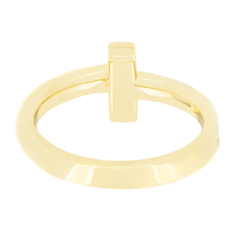 From their iconic T collection comes this beautiful diamond set Tiffany & Co. ring. Crafted in 18 carat yellow gold, the ring is designed in the classic T shape with 0.09 carat of round brilliant diamonds pavé set around part of the band. Each diamond matches in quality at F in colour and VVS2 in clarity. The original Tiffany & Co. hallmarks can be found along the inside of the band.