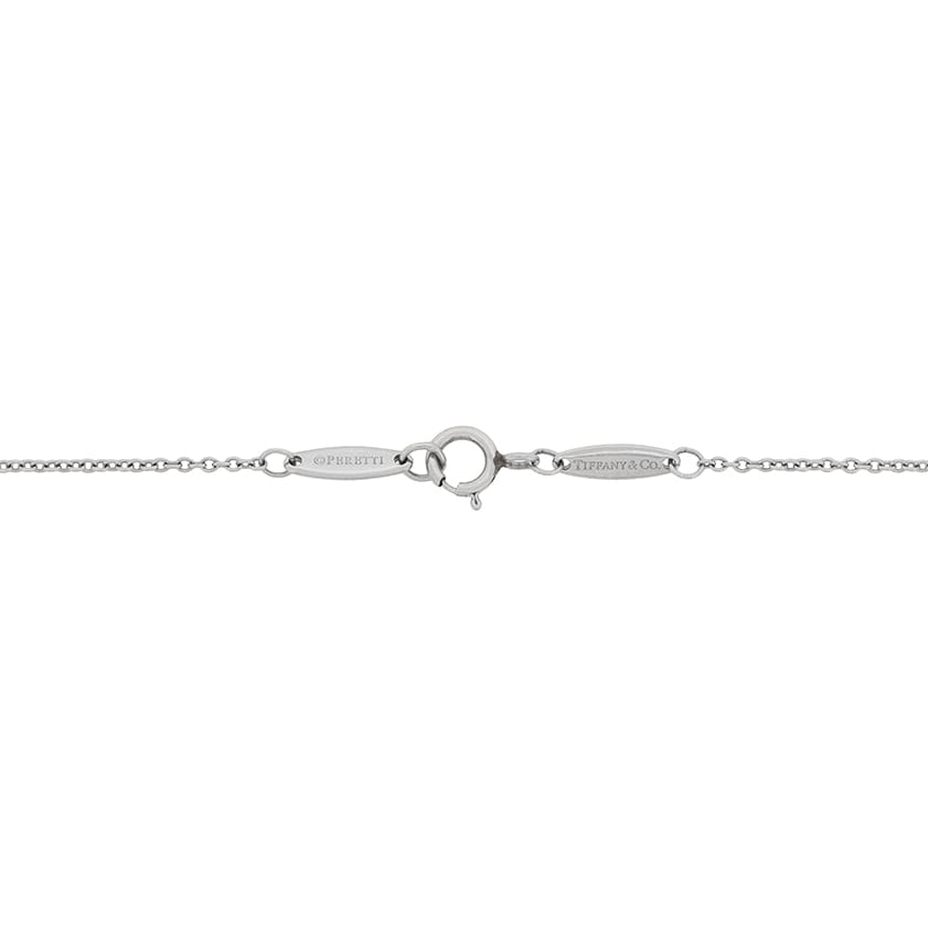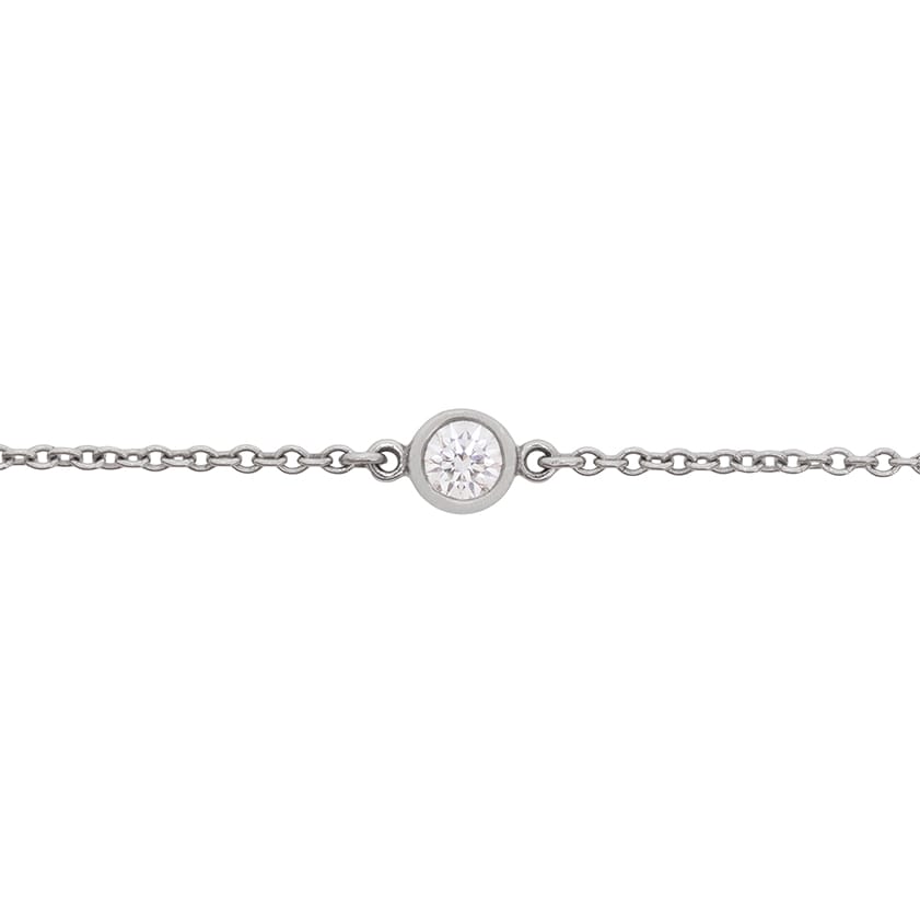 This long necklace is from the Elsa Peretti collection by Tiffany & Co. and is known as the ‘Diamonds By The Yard’ necklace. It features rub over set round brilliant diamonds positioned at different points throughout the chain. The diamonds have a combined weight of 0.51 carat and there are 9 of them in total. 30 Inches long, it is an elegant and delicate piece of jewellery by design. It has been authenticated by the makers marks.