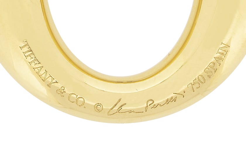 From the Sevillana collection, presented by Else Peretti for Tiffany & Co. The ‘O’ pendant is made from 18 carat yellow gold and has 26 rub over set diamonds. The stones have a combined weight of 0.26 carat and have been graded as F in colour and VS in clarity. The pendant has the original makers mark and hangs from a T&Co string.