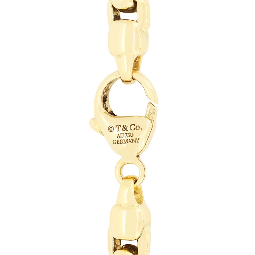 From Tiffany & Co. comes this stunning oval link chain. Crafted in 18 carat yellow gold, this chunky 20″ chain is 5mm in width and weighs 74 grams. The original Tiffany & Co. makers marks can be found on the clasp.