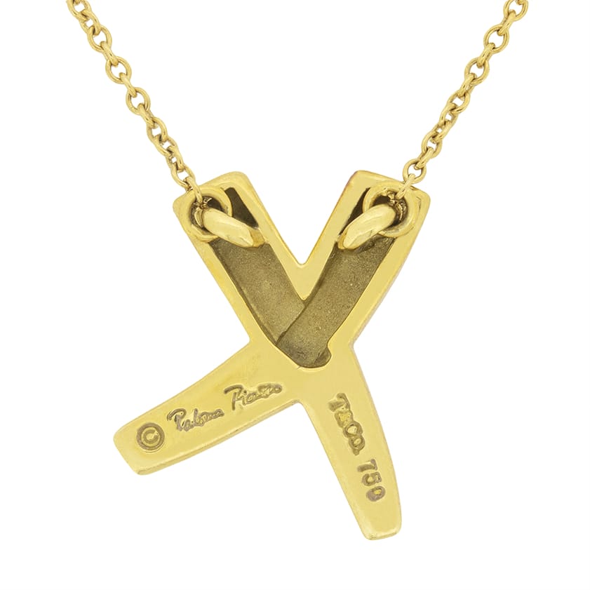 Tiffany & Co. Picasso Paloma’s ‘Graffiti X’ Necklace in 18 carat yellow gold. The classic design sits on the original 18 carat yellow gold chain, and all Tiffany & Co. markings are present. This necklace would make a lovely gift!