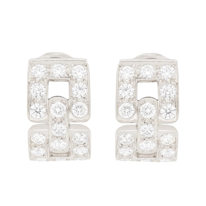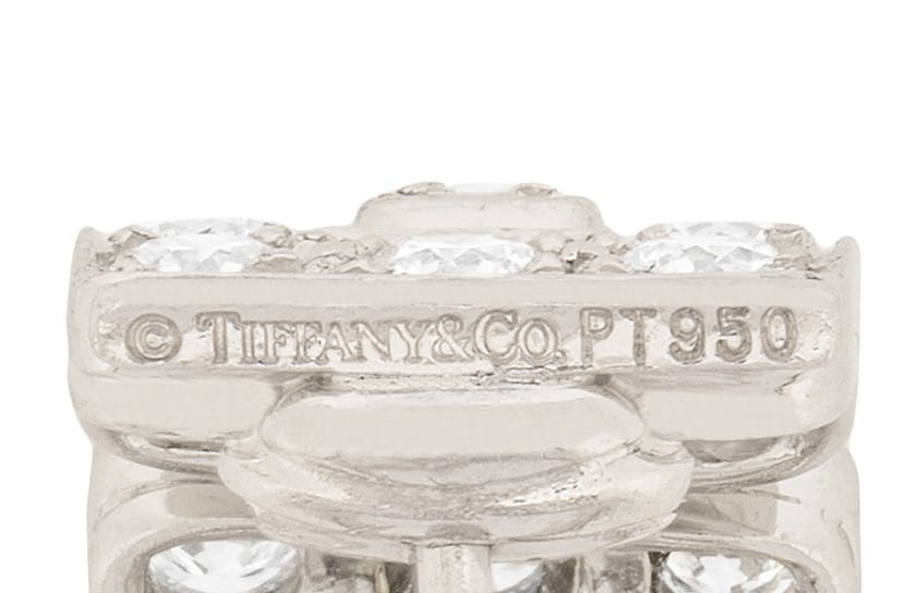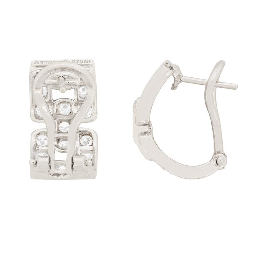 This Tiffany & Co. earrings date to the 1990s and are the hoop huggie deco design. Each earring has 17 round brilliant diamonds, each on weighing 0.05 carat. They have been estimated as F in colour and VS in clarity. The earrings have the makers mark and are for pierced ears. These lovely earrings would make a great gift!