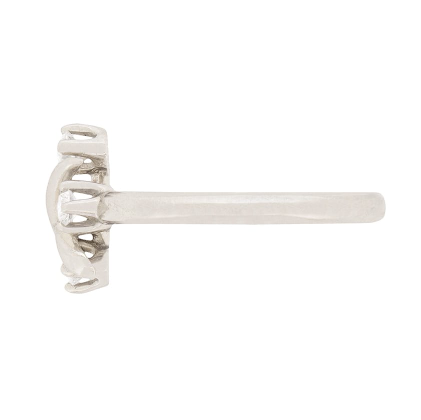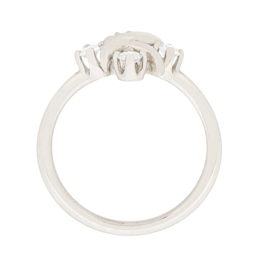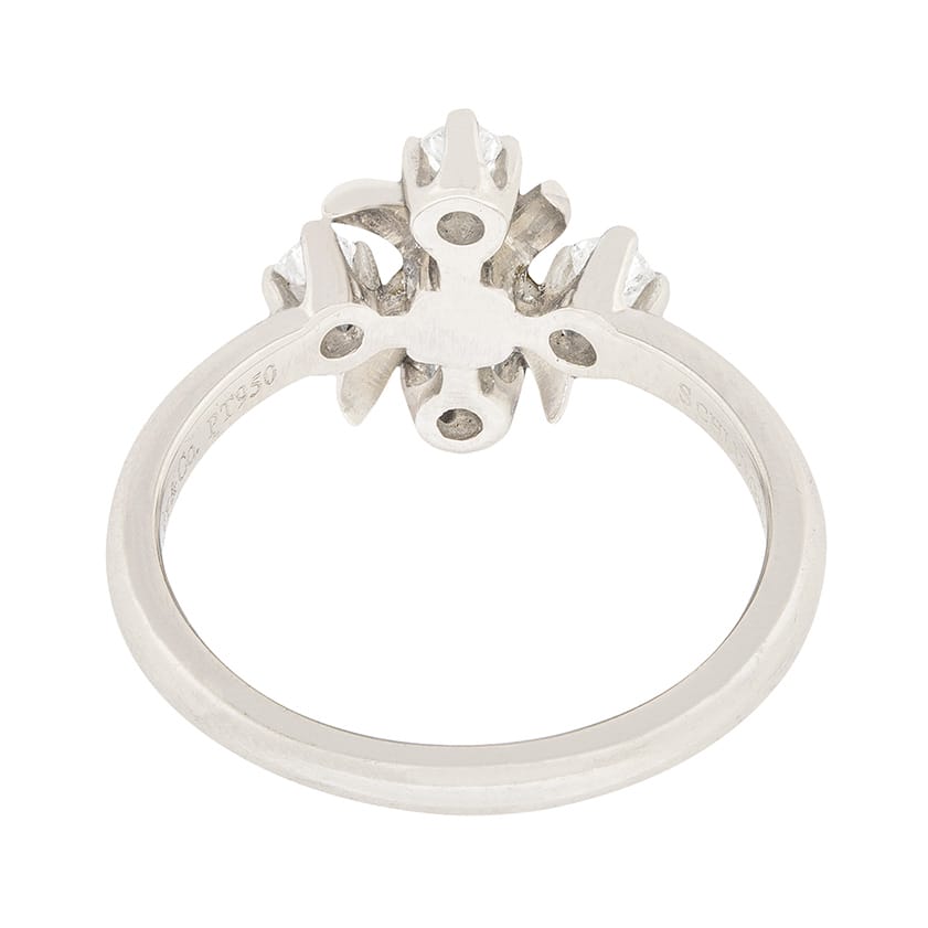 Jean Schlumberger’s jewellery designs for Tiffany & Co. have long been favourites of the world’s most fashionable women. This elegant Tiffany & Co. Schlumberger ‘Lynn’ diamond ring is comprised of platinum, featuring Jean Schlumberger’s iconic dynamic ‘X’ design, with one impeccable, round brilliant cut, Tiffany & Co. diamond set at each of its cardinal points. They total 0.20 carat, and are held to the high standards of Tiffany & Co, having been estimated G in colour and VS in clarity. This authentic, pre-owned ring is signed ‘Tiffany & Co.’ with the appropriate makers marks.