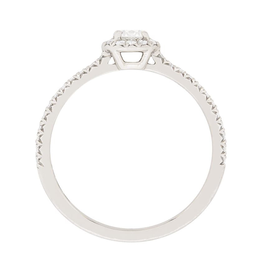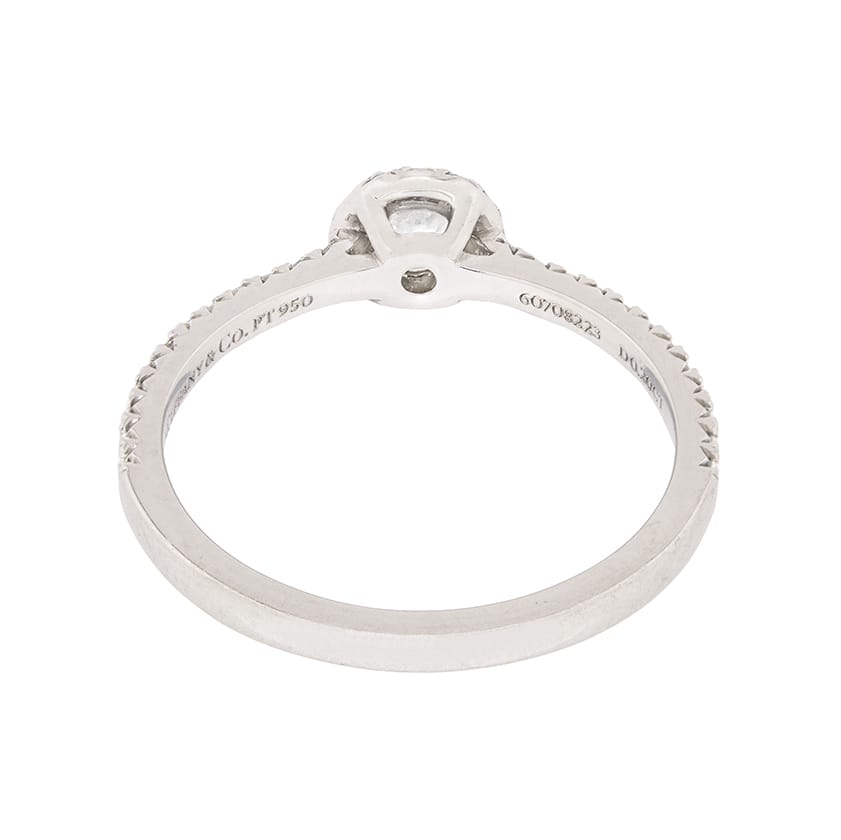 This second-hand Tiffany & Co ring features a claw set 0.20 carat diamond within a halo setting. This design is from the Soleste collection at Tiffany & Co. The centre diamond has been certified by Tiffany & Co as a H in colour and IF in clarity, which is Internally Flawless. The sparkling stone is highlighted beautifully by the halo which contains 0.13 carat’s worth of round brilliants. All the diamonds are claw set within platinum and the ring has the original Tiffany & Co makers marks.