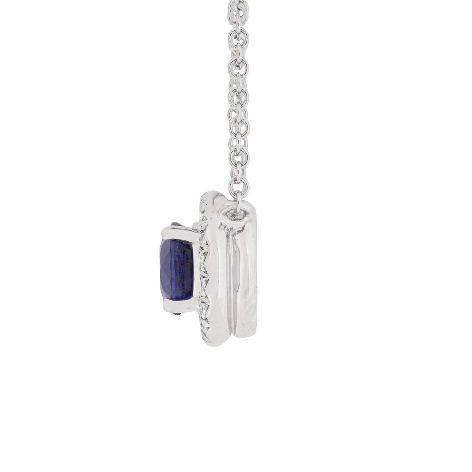 An elegant pendant from the Tiffany & Co Soleste collection. It features a wonderfully deep blue sapphire in the centre weighing 0.40 carat. The sapphire is then surrounded by a halo of high quality diamonds, weighing 0.09 carat in total. They are G in colour and VS in clarity. The setting is made of platinum, as is the chain. The piece has the original makers marks from Tiffany & Co.
