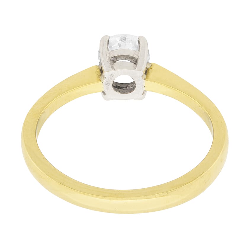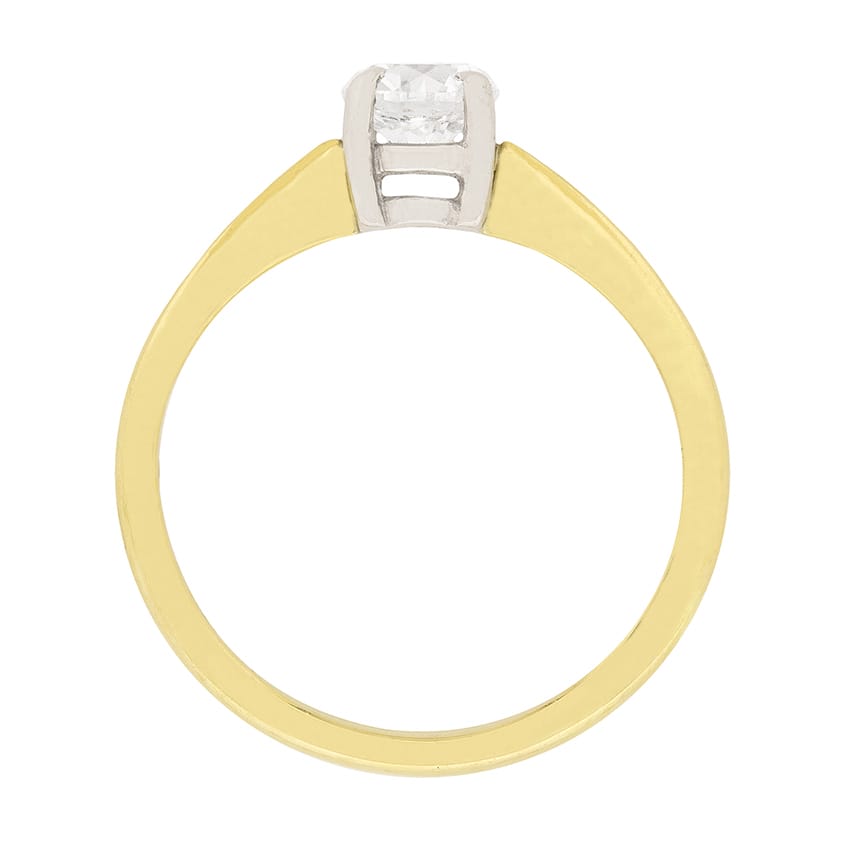 This classic diamond solitaire engagement ring sparkles with one high-quality round brilliant cut diamond of F colour and VS1 clarity, which is set in an open back, four claw, platinum mounting. A solid 18 carat yellow gold shank with tapered shoulders complete this traditional engagement ring with elegance.
