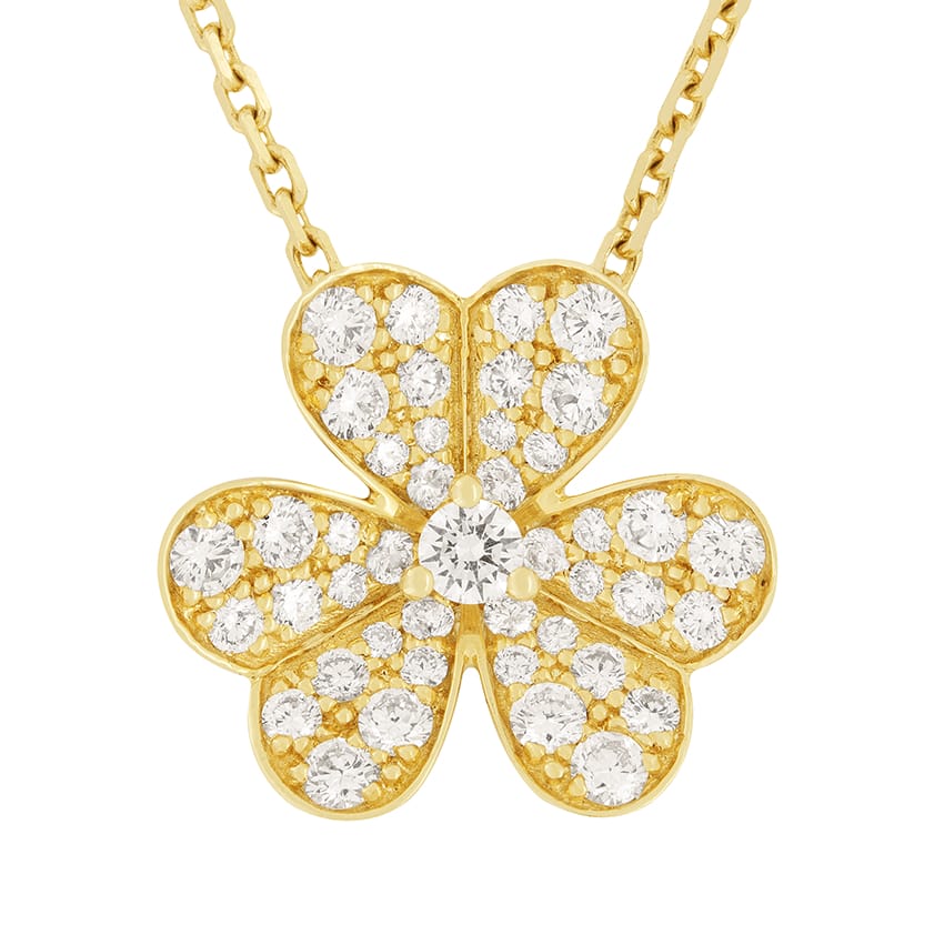 A beautiful diamond pendant from Van Cleef & Arpels Frivole collection. Each flower petal is set with an assortment of round brilliant cut diamonds, all varying in sizes. Combined, they total to 0.81 carats, including the larger central stone. Their quality varies from D-F in colour and IF-VVS in clarity. The heart shaped petals give a sweet and romantic look. It is a small model, in 18ct yellow gold with a 17″ chain.