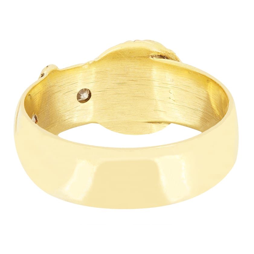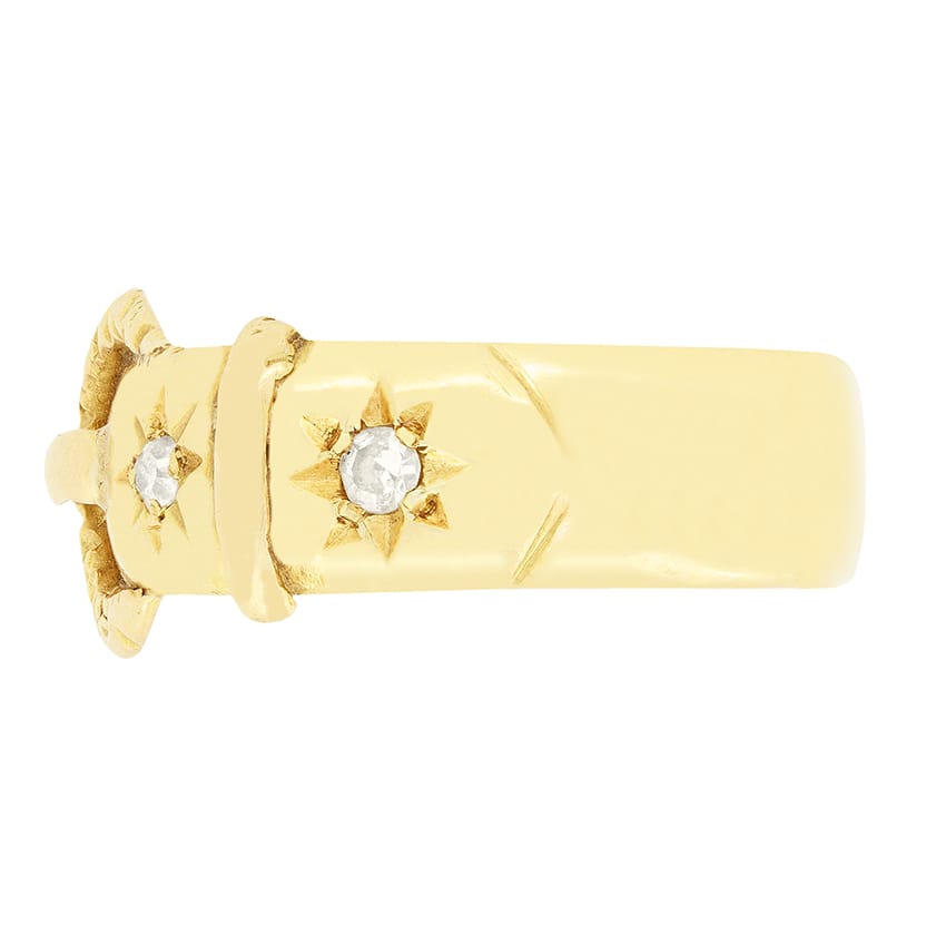 Dating to the Victorian era, this buckle ring is a wonderfully curious piece. Crafted in 18 carat yellow gold, the chunky 6.4mm band is adorned with a pair of star set, old cut diamonds. Each stone sits at 0.05 carat and matches in quality at H in colour and SI in clarity. The buckle design adds charm to this piece, standing it out from your classical diamond band designs.