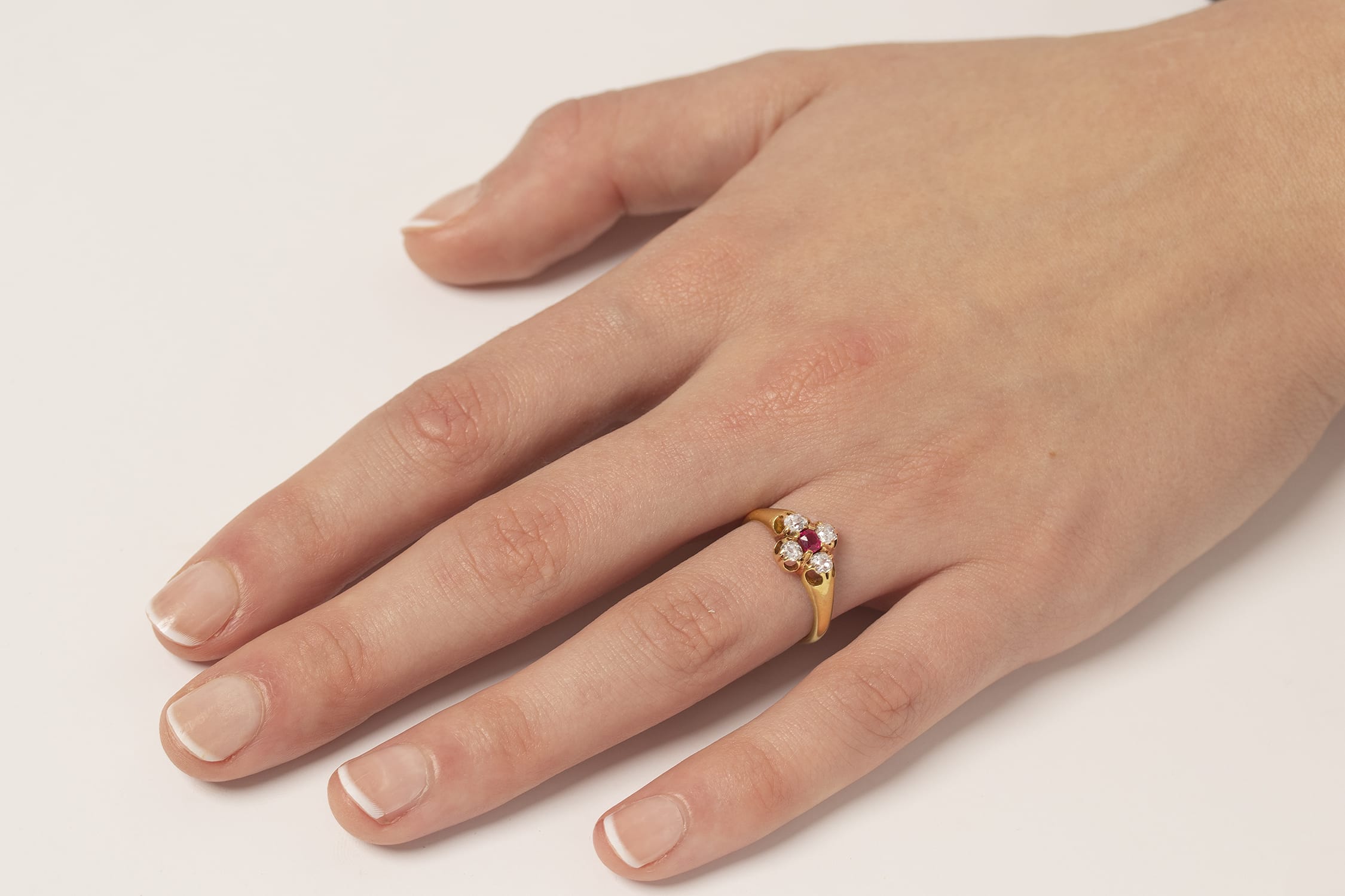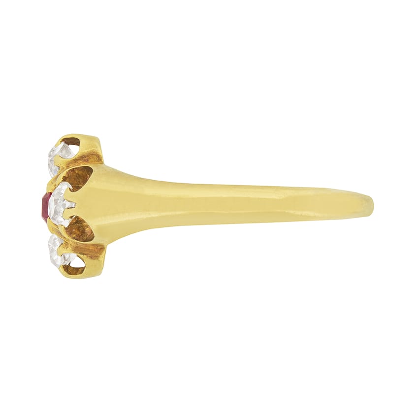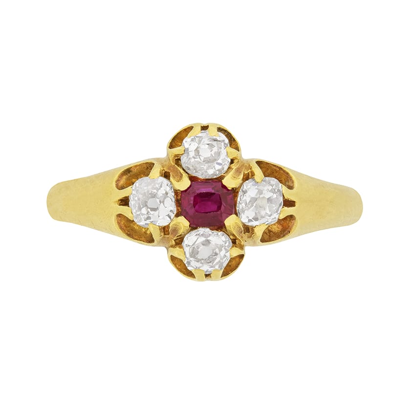 Four old cut diamonds surround an old cut ruby in this Victorian ring. The diamonds are 0.15 carat each, matching the 0.15 carat ruby. The diamonds total to 0.60 carat, and are G colour and VS clarity. They are all old cushion cuts, and would have been cut by hand at the time. The gems are held within open framework claw settings in the 18 carat gold ring. This is a lovely Victorian ring dating to the 1880s.
