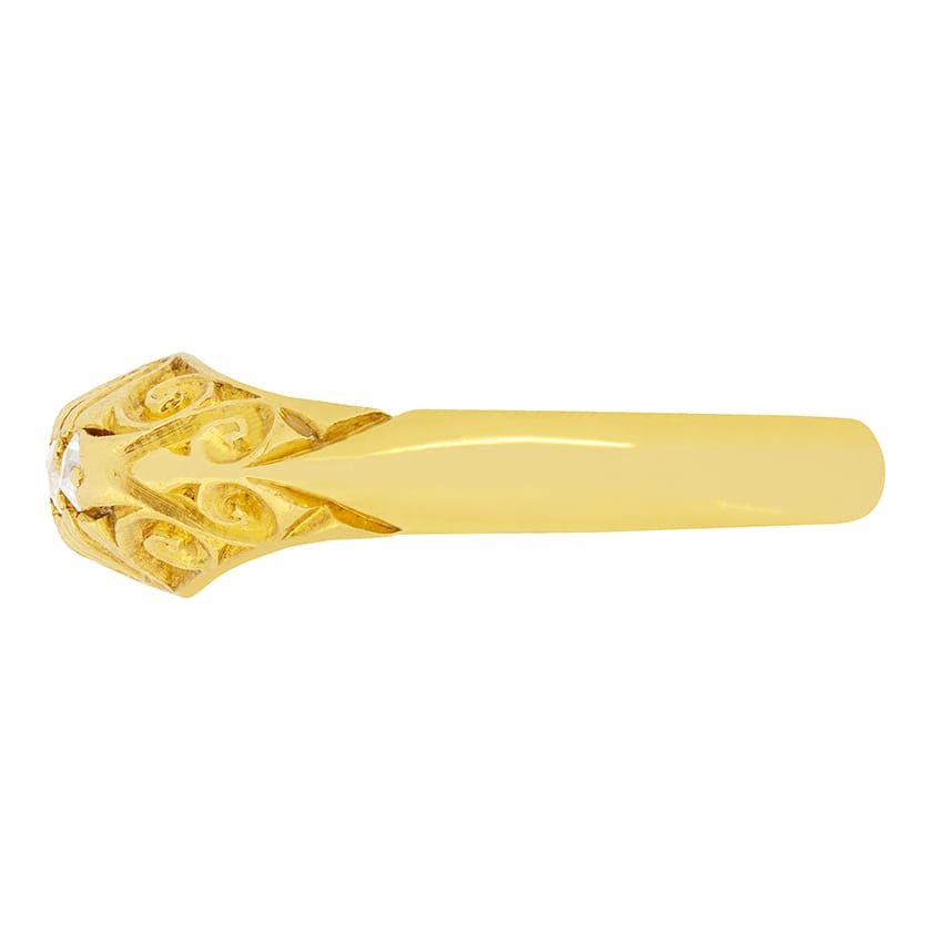 Five old cut diamonds are set in this sweet Victorian ring. They vary in sizes, starting with the largest in the centre and the rest gradually getting smaller. It has a total carat weight of 0.17. The shank has incredible detailing which shows expertise craftsmanship. It has been made in 18ct yellow gold and has a hallmark dating to 1905.