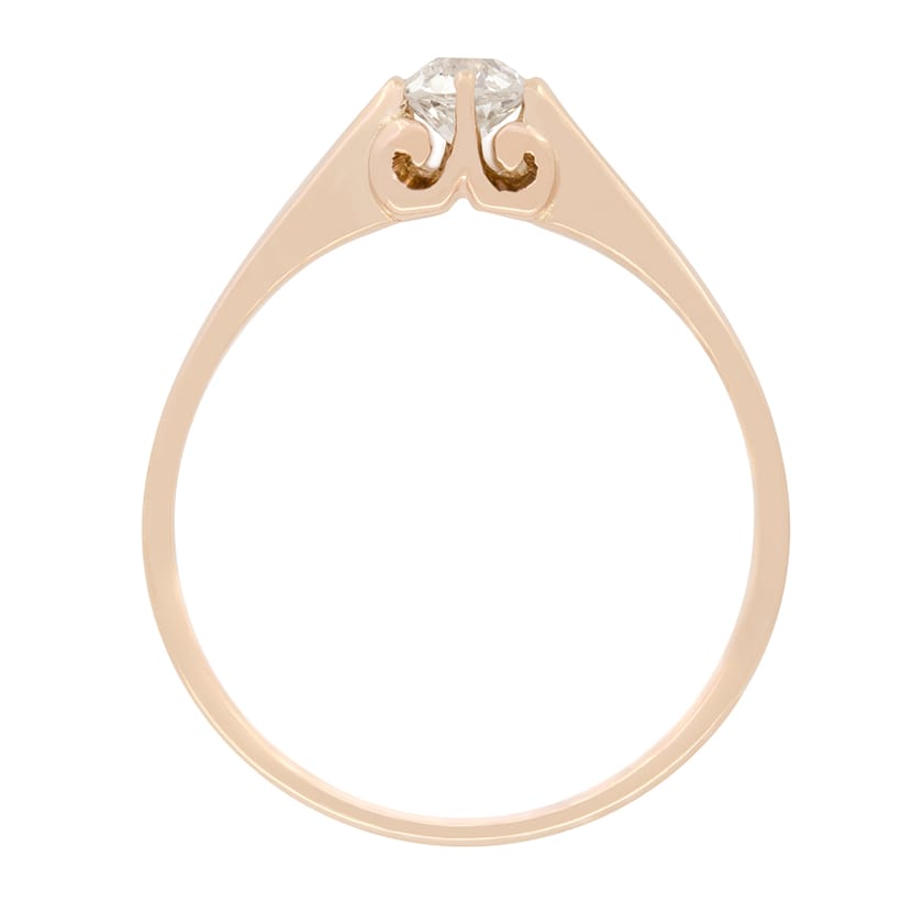 This timeless solitaire from the Victorian period features a 0.30 carat old cut diamond at it’s centre. The diamond has a colour of I and clarity of VS1. Claw set into a uniquely shaped collet and band crafted in 18 carat rose gold, this piece is a unique take on the classic engagement ring style.