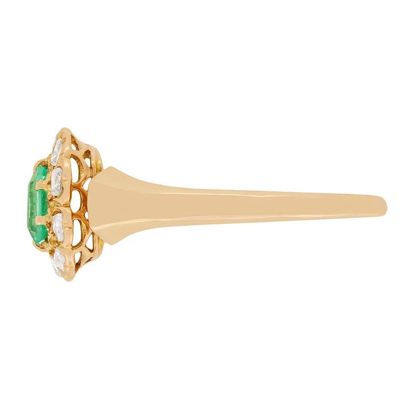 This beautiful Emerald ring dates back to the 1880s. It features a claw set 0.30 carat emerald cut emerald in its centre haloed by ten rose cut diamonds. The diamonds weigh a total of 0.20 carat. The ring itself has been hand crafted from 14 carat rose gold.